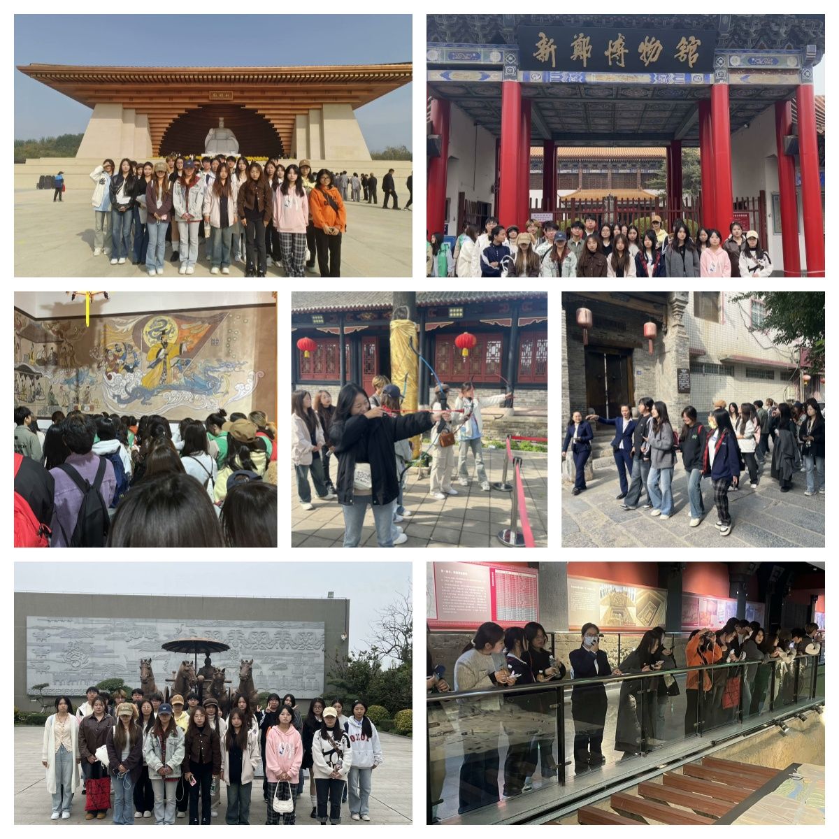 第一站大家跟随历史的脚步来到了黄帝故里,“三月三,拜轩辕”就是在此地举行的。黄帝故里是中华民族的精神家园和全球华人拜祖圣地,这里承载着中华民族五千年的文明传承,是华夏子孙寻根问祖的重要场所,同学们对此感到自豪,纷纷拍照留念。接下来同学们继续前往新郑市考院博物馆参观。跨入考院门前高高的门槛,就被院内高度还原的场景深深吸引住了,内部布展展示了中国科举制度和新郑科举考试方面的相关历史文化,分为科举历史、考院春秋、学优名仕、文韬武略、科考人生5个展览环节,展区以历史文物展示及策展为主体,并通过多媒体等方式,阐述科举延续约1300年的历史进程。同学们勇于参加考院内设置挑战项目,身临其境的感受历史科举考试文化。跟随着队伍的步伐同学又前往了新郑博物馆,新郑市博物馆有藏品数量6万余件,三级以上文物4400余件,包括文物、历史图片、实物等多种形式的展品。同学们主要参观了“郑韩文化”、“华夏之根”、“馆藏瓷器展示”等三个展厅。最后我们来到了新郑郑国车马坑景区,在讲解员的带领下,同学们先后参观了文物展厅、中字型大墓、3号车马坑、大夫墓等文物景点。讲解员为同学们讲述了文物的故事,介绍了郑国的发展历程,馆中高度还原的精美仿制品让同学们切实感受到了历史文化的魅力。