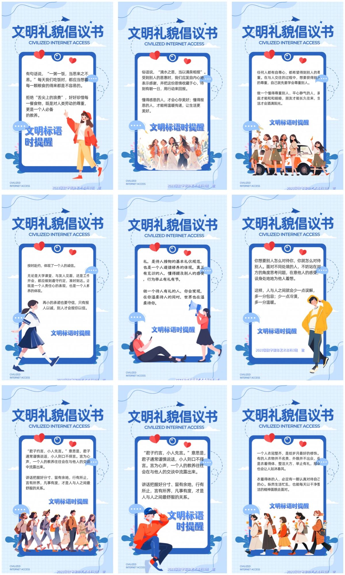 本次活动目的是通过有创意、有趣的微视频与手绘、海报作品,线上和线下同步进行的方式,吸引师生的关注,增强文明礼貌月的宣传效果,提升师生文明水平。同学们结合文明课堂、文明校园、文明宿舍、文明教室方面,通过简洁明了的方式传达了此次文明礼貌月的主题,展现了同学们良好的精神风貌,广泛宣传了文明礼仪的重要性,营造浓厚的活动氛围,让员工们意识到文明礼仪在日常学习生活中的重要意义。
