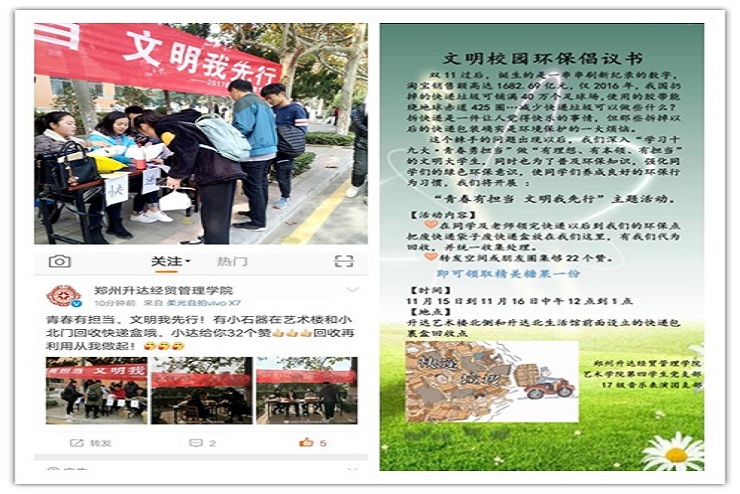 活动初期通过QQ空间、微信、微博进行广泛宣传,希望大家积极参与活动。“青春有担当,文明我先行”,要求我们用实际行动来证明自己是一个有担当、懂文明的人。而这次活动,主要是通过集中处理快递的废盒子、废袋子,来减少垃圾乱扔乱放现象,保持校园环境的整洁,为同学们提供一个良好的学习和生活场所,更好地增强“四个意识”,牢固树立“四个自信”,从点滴做起。