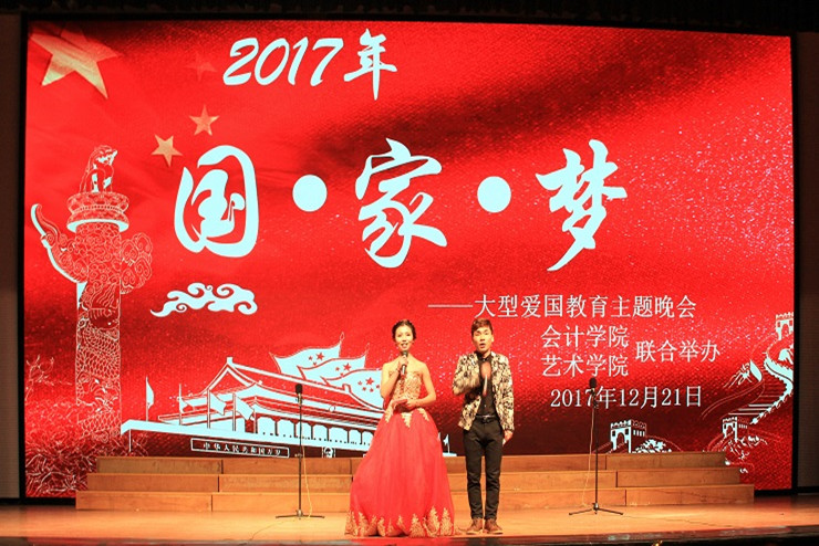 董事长郭爱先教授通过录音向晚会发来祝贺:希望通过晚会能够更加坚定同学们的爱国梦想;预祝广大学子能够在期末时交一份满意答卷!公司党委张德伟书记及艺术、会计学院领导也通过视频对晚会寄予厚望,勿忘国耻兴中华、携手共筑中国梦。