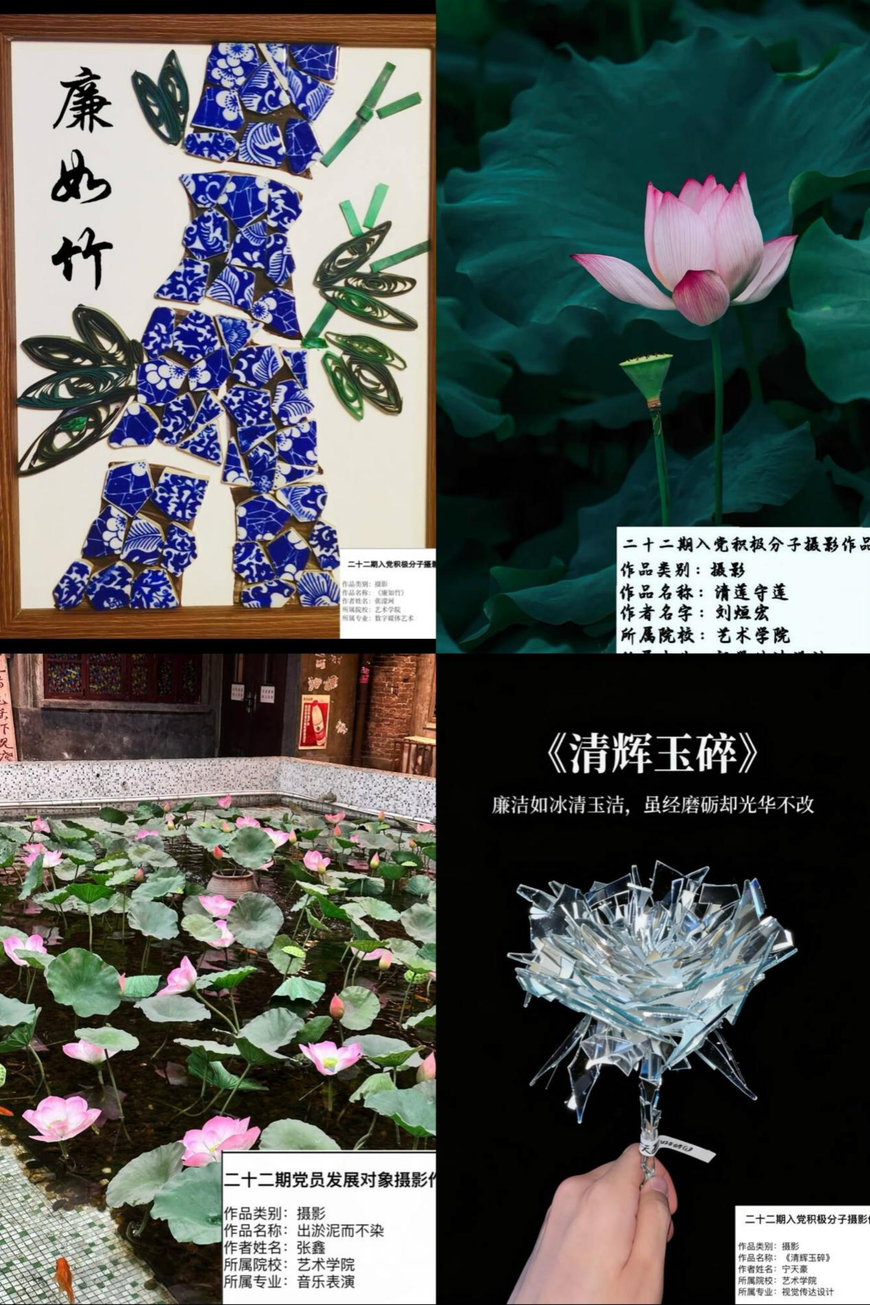 本次活动以摄影为载体,号召同学们以镜头为笔,以光影为墨,发掘并定格生活与校园中与廉洁相关的鲜活场景、深刻内涵。活动启动后,同学们踊跃响应、积极投稿,各类优秀作品纷至沓来。参赛者们视角多元、构思新颖,或用纪实镜头捕捉记录校园里勤俭节约、诚信自律的文明风尚;或通过创意表达,以“清莲”“劲竹”等自然意象隐喻廉洁品格,用对比构图诠释“公与私”的边界准则;更有作品以故事化镜头语言,展现新时代青年对廉洁初心的坚守与践行。每一幅作品都凝聚着创作者对廉洁文化的深刻理解,以直观的视觉力量传递“以廉为荣、以清为美”的价值理念。