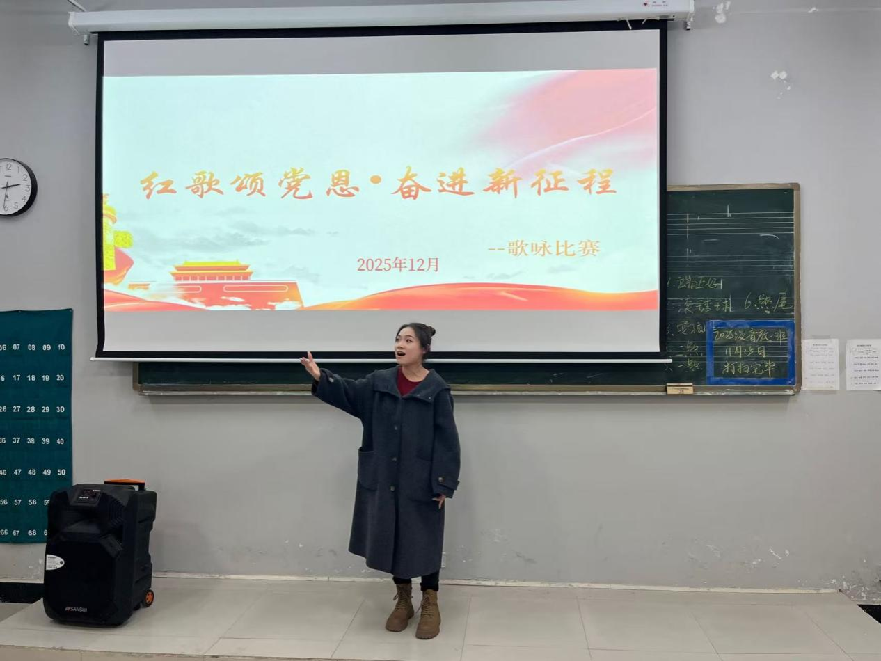 活动现场气氛庄重热烈,参赛选手们以饱满热情唱响《没有共产党就没有新中国》《歌唱祖国》《走向复兴》等红色经典歌曲,还创新融入队形编排、手语表演等形式,让红色旋律焕发时代活力。评委老师从演唱技巧、情感表达、舞台表现等维度专业打分,现场掌声与欢呼声此起彼伏。