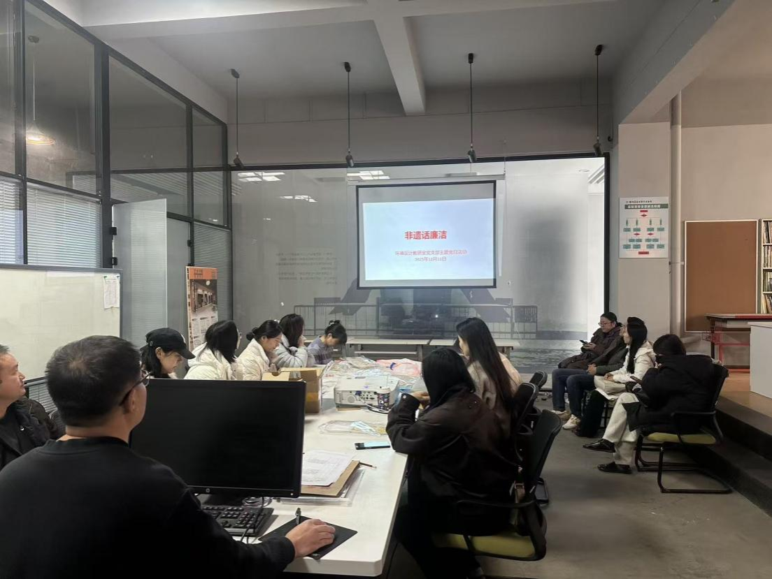 为深入推进党风廉政建设,强化党员教师的廉洁自律意识,将中华优秀传统文化与师德师风建设深度融合,12月11日下午,环境设计教研室党支部组织的“非遗话廉洁”主题党日活动顺利举行。本次活动由党支部书记姜新宇主持,环境设计教研室党支部全体党员教师参与此次活动。