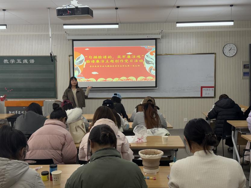 为创新廉洁教育形式,将传统文化与党性教育相结合,12月12日,音乐表演与舞蹈表演专业员工第一党支部在艺术楼301教室成功举办“勾描脸谱韵,筑牢廉洁魂”脸谱廉洁主题创作活动。党支部书记吕文娟同志、党支部组织委员杨孟珂同志和党支部宣传委员李慧同志出席活动,党支部全体成员和入党积极分子参与,活动由党支部书记吕文娟同志主持。