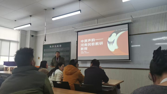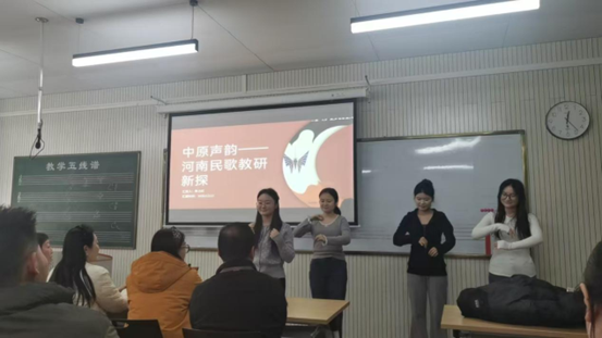 为推动本土艺术资源与教学实践深度融合,12月18日中午,声乐合唱教研室柴占红老师主持的“中原声韵——河南民歌教研新探”主题教研活动在学院多媒体教室成功举办,教研室专业教师参与研讨交流。