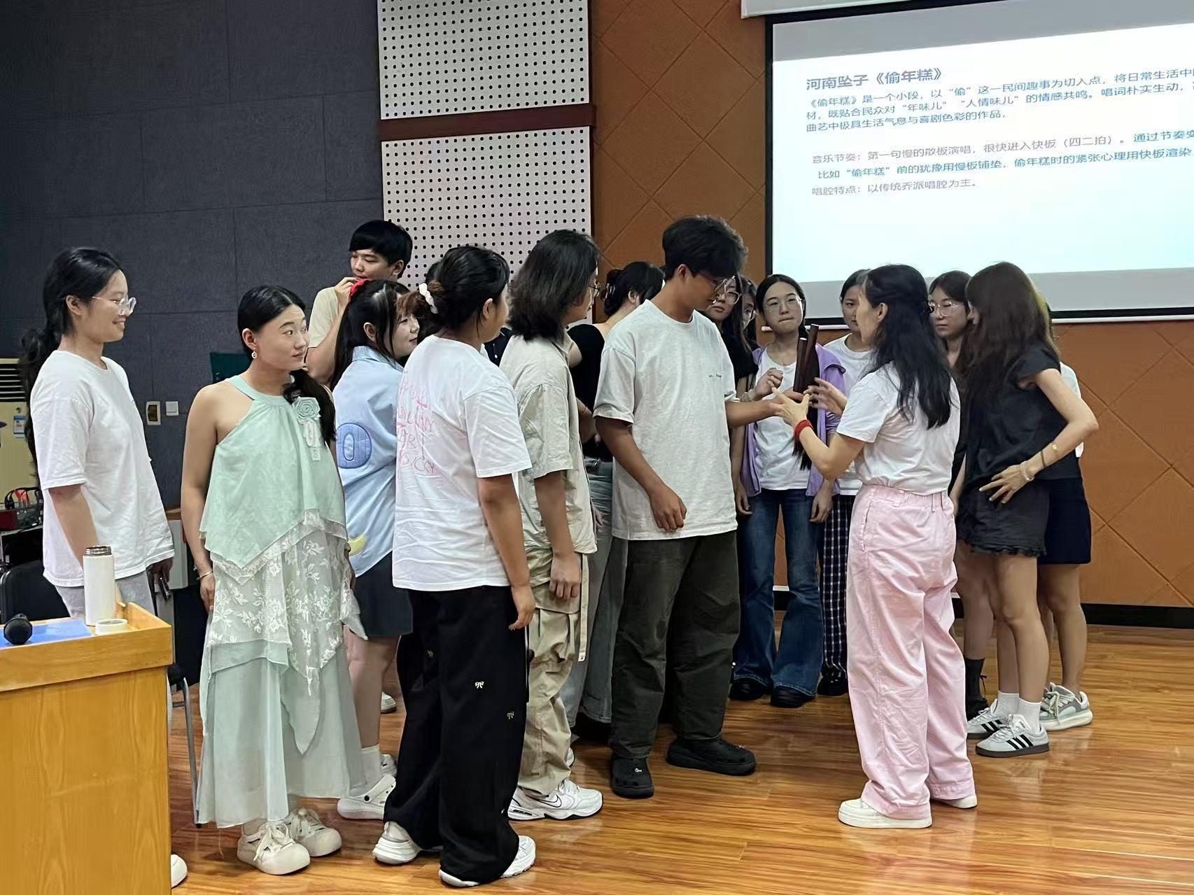 课堂上,张老师系统梳理了河南坠子的起源与发展脉络,娓娓道来间勾勒出这一流行于26个省份的曲艺瑰宝的发展轨迹。她还详细讲解了河南坠子的艺术特色,介绍了起腔、平腔等核心唱腔及单口、对口等表演形式,并结合《偷年糕》《借髢髢》等经典曲目,阐释其贴近生活的艺术特质。