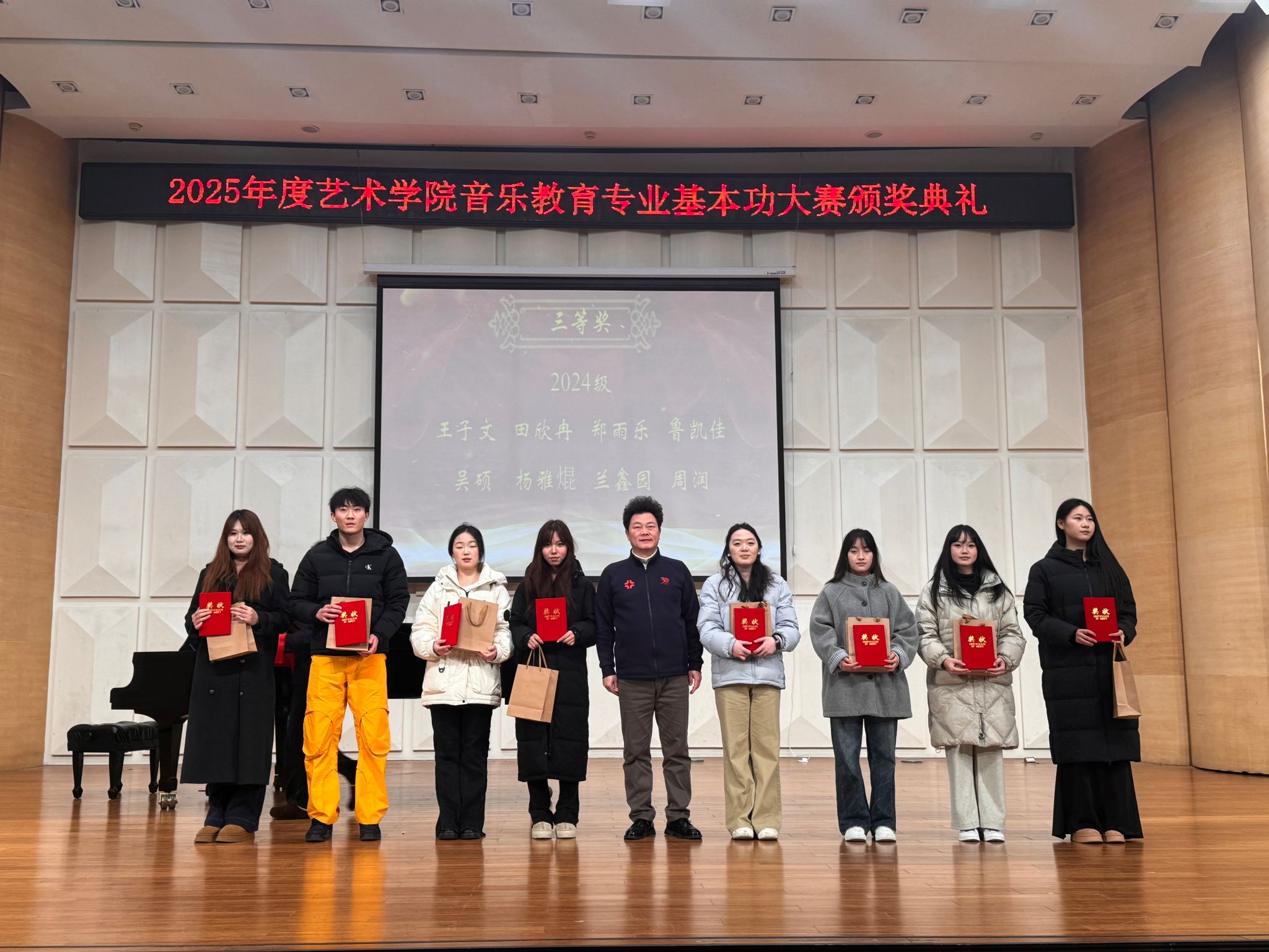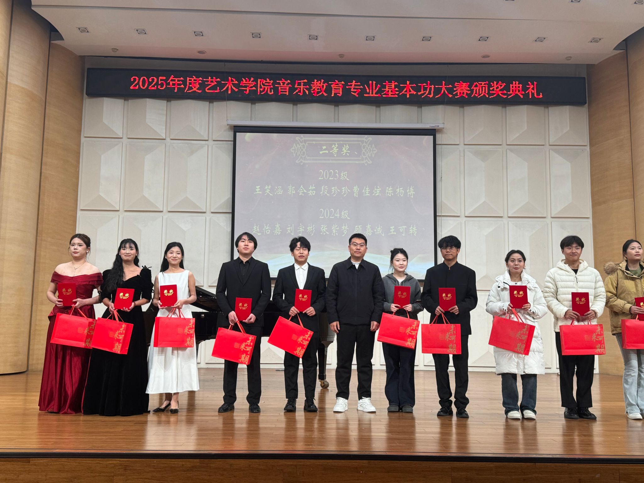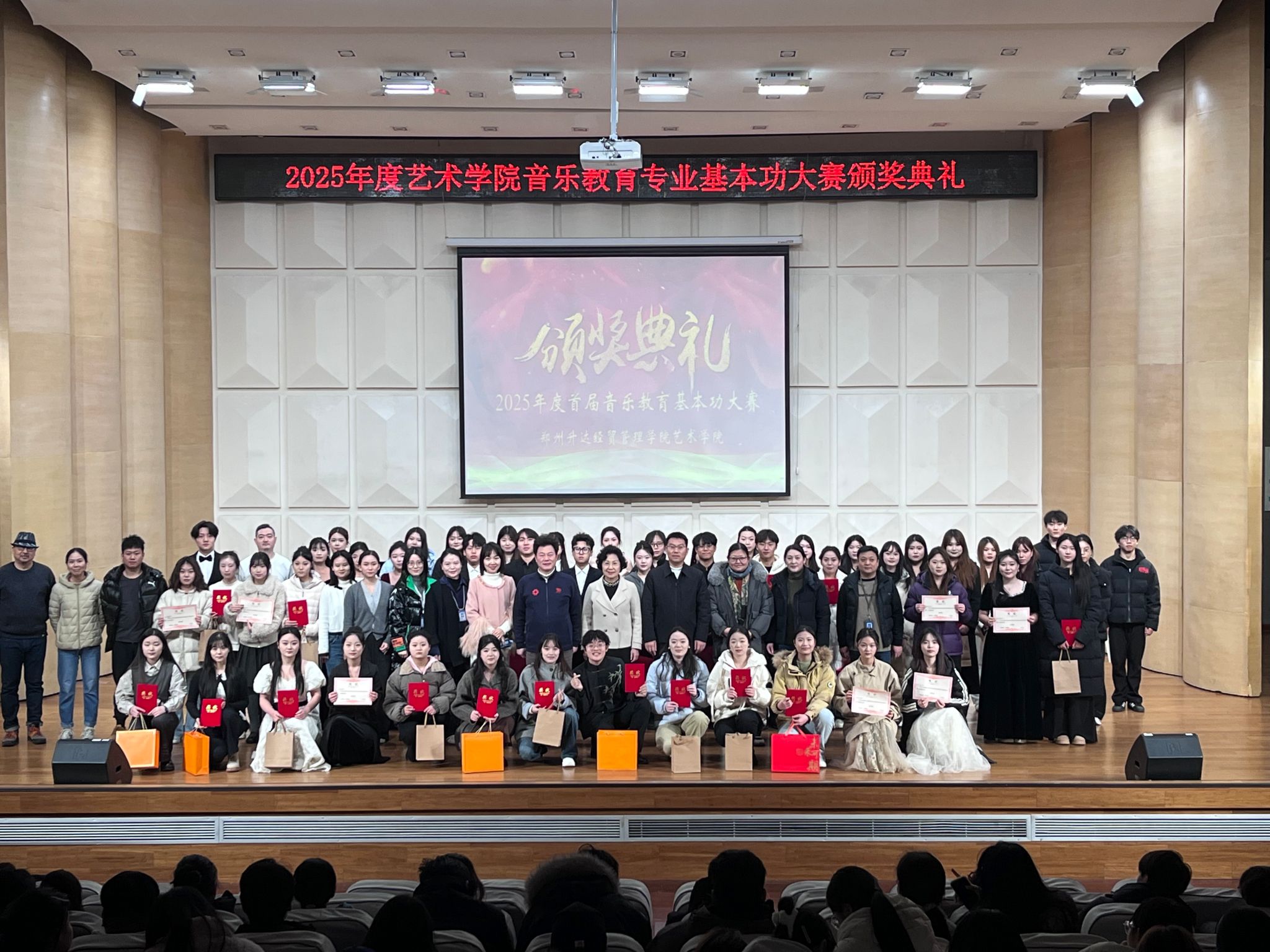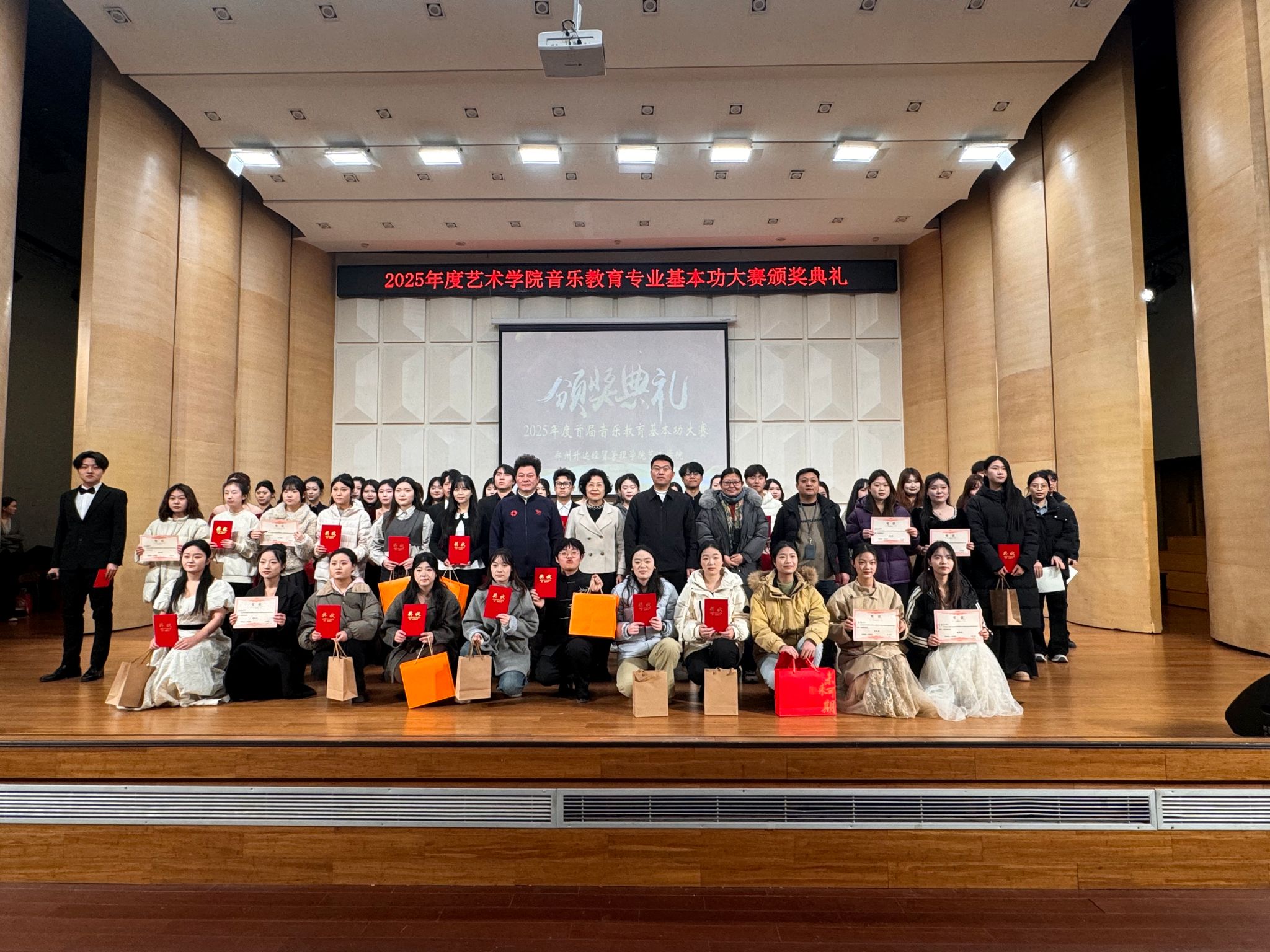 随后全体获奖员工与学院领导、评审老师合影留念,记录下这一荣誉时刻。一张张奖状,见证了同学们从初赛到复赛的辛勤付出与蜕变成长;一声声叮嘱,承载了学院对应用型音乐教育人才培养的坚定信念与厚望。