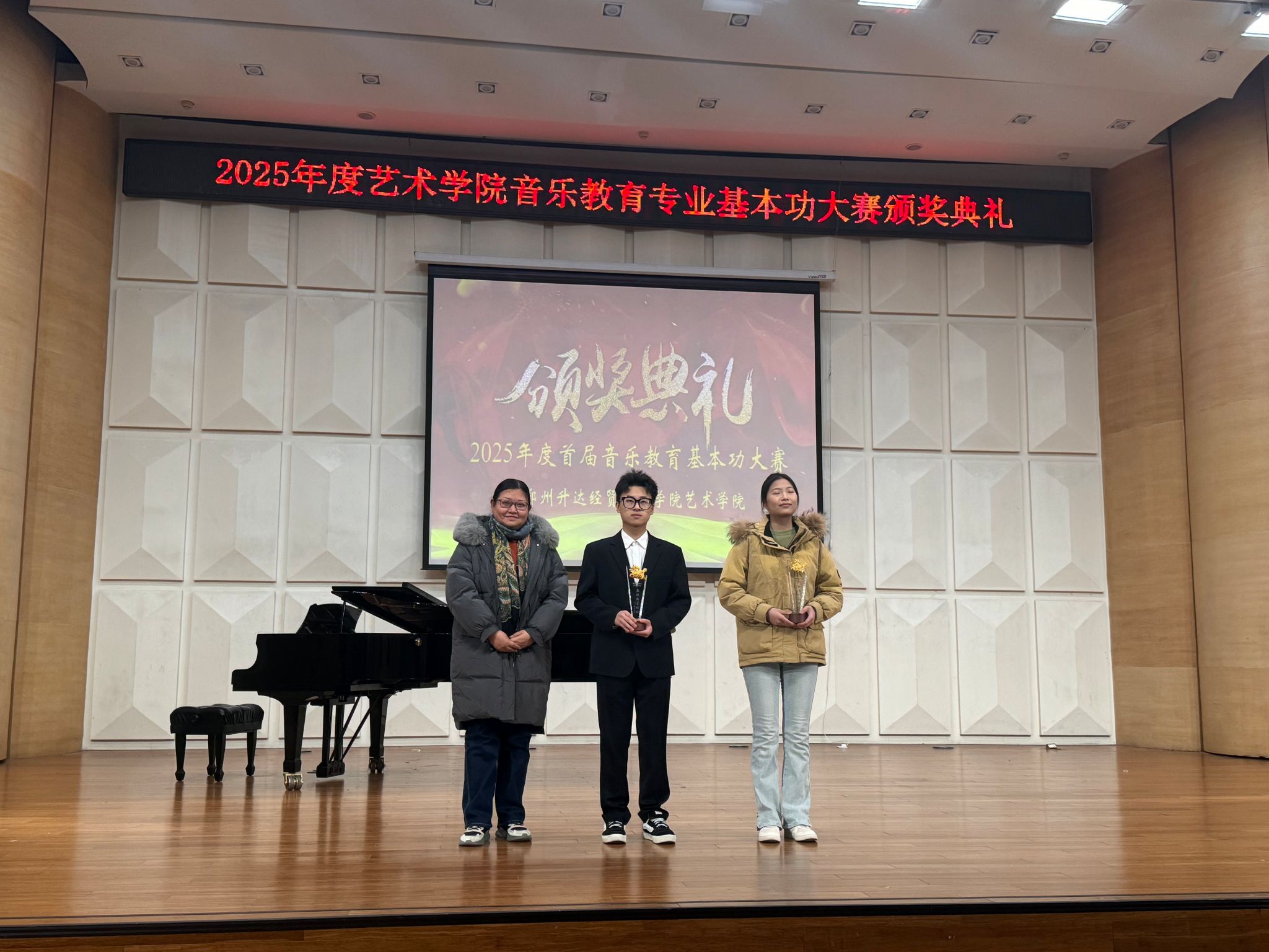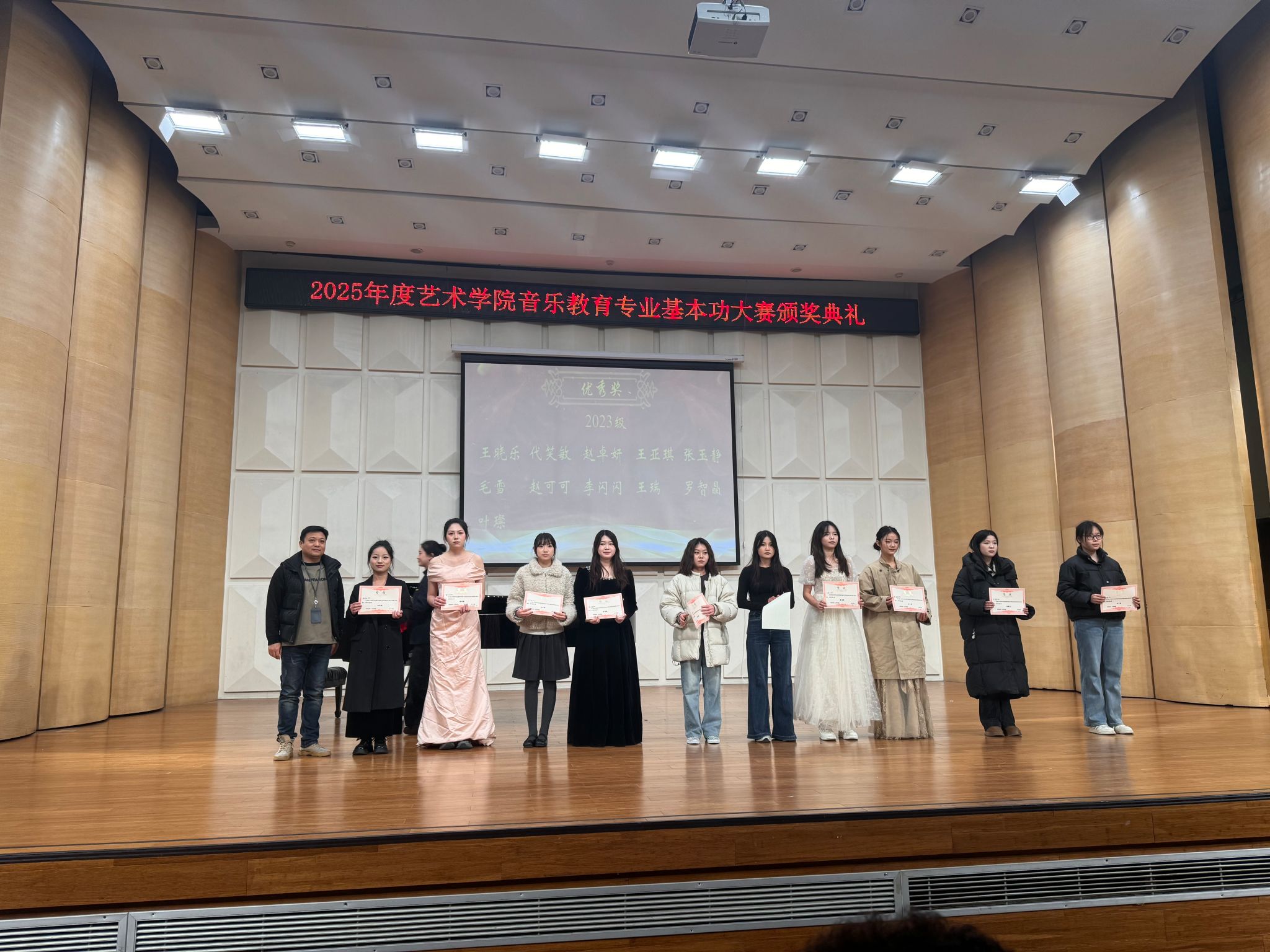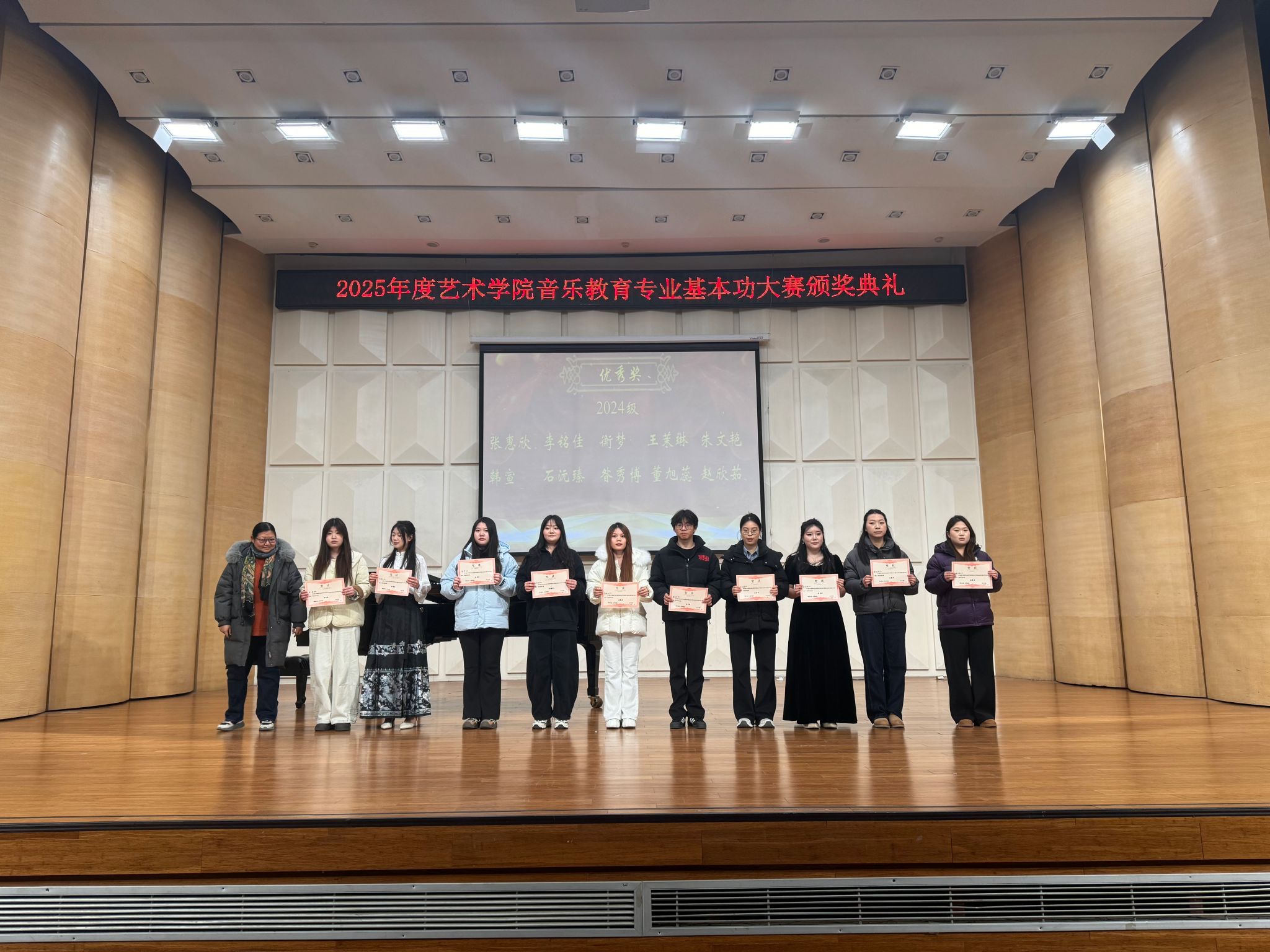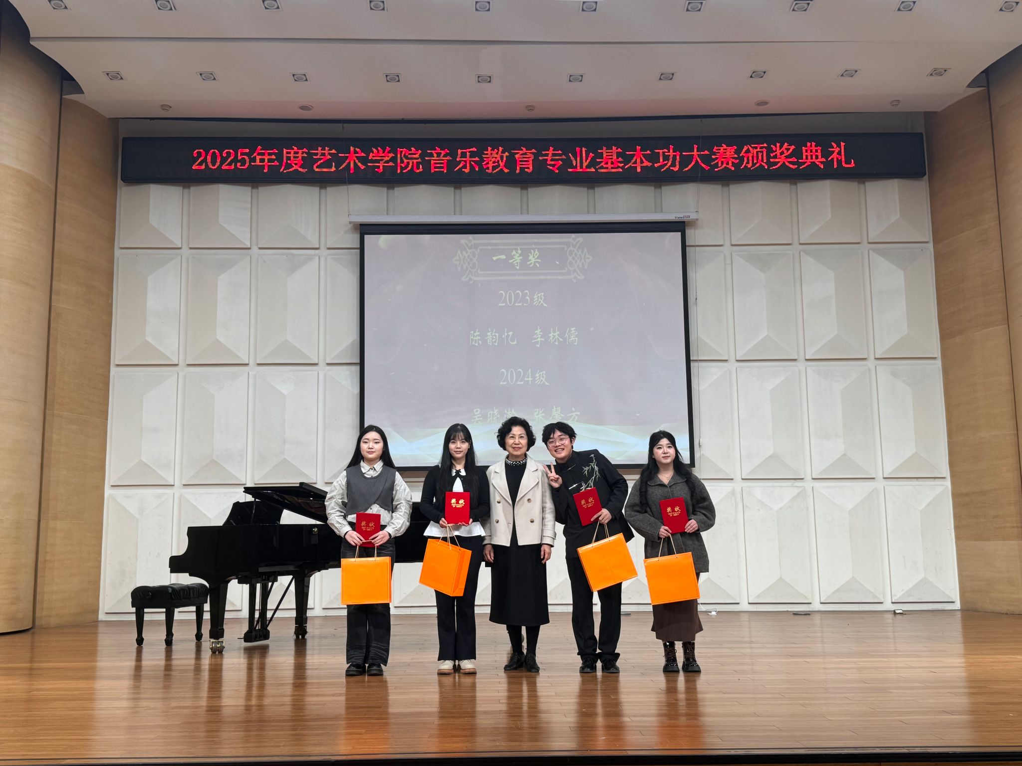 随后全体获奖员工与学院领导、评审老师合影留念,记录下这一荣誉时刻。一张张奖状,见证了同学们从初赛到复赛的辛勤付出与蜕变成长;一声声叮嘱,承载了学院对应用型音乐教育人才培养的坚定信念与厚望。