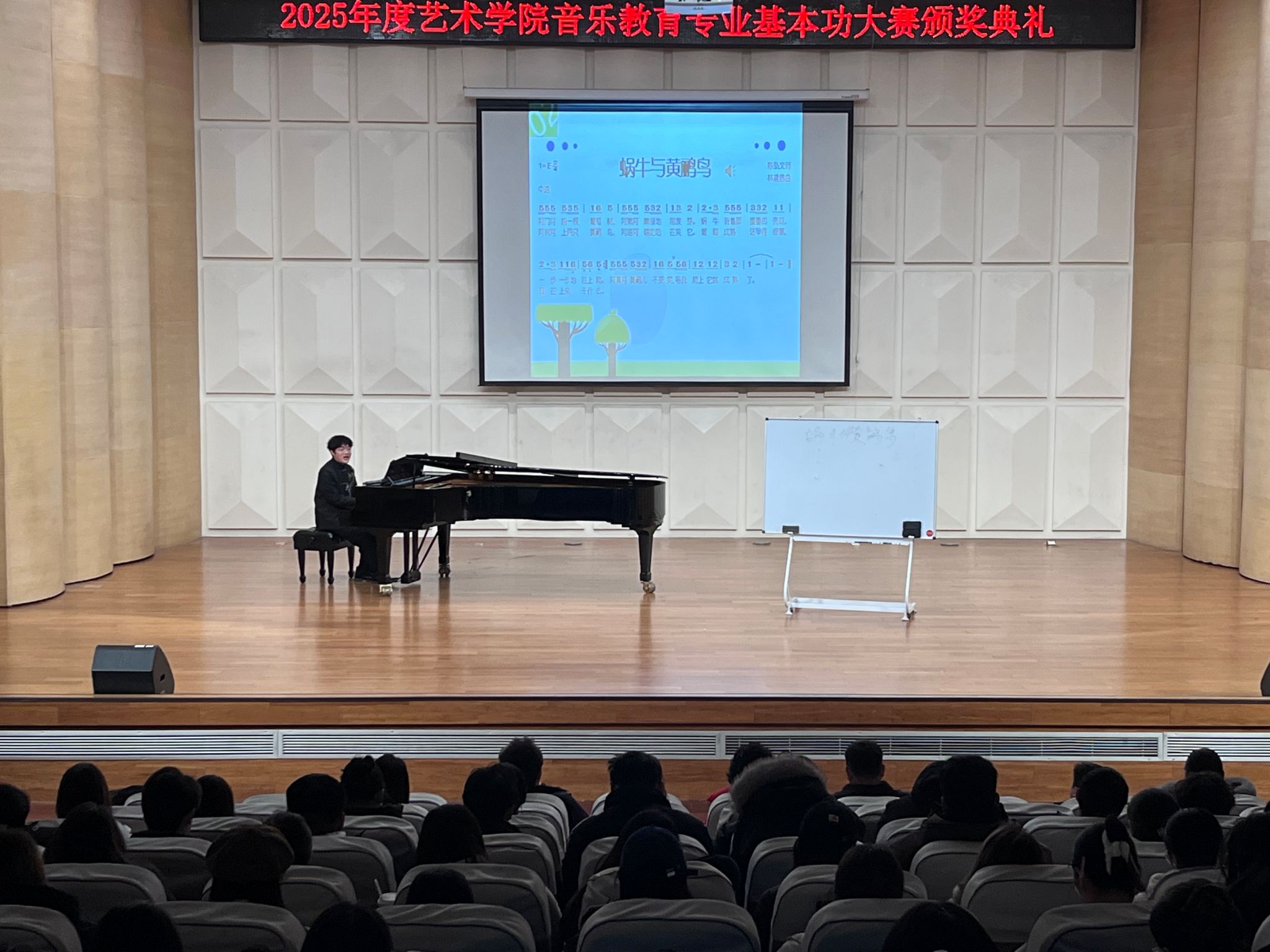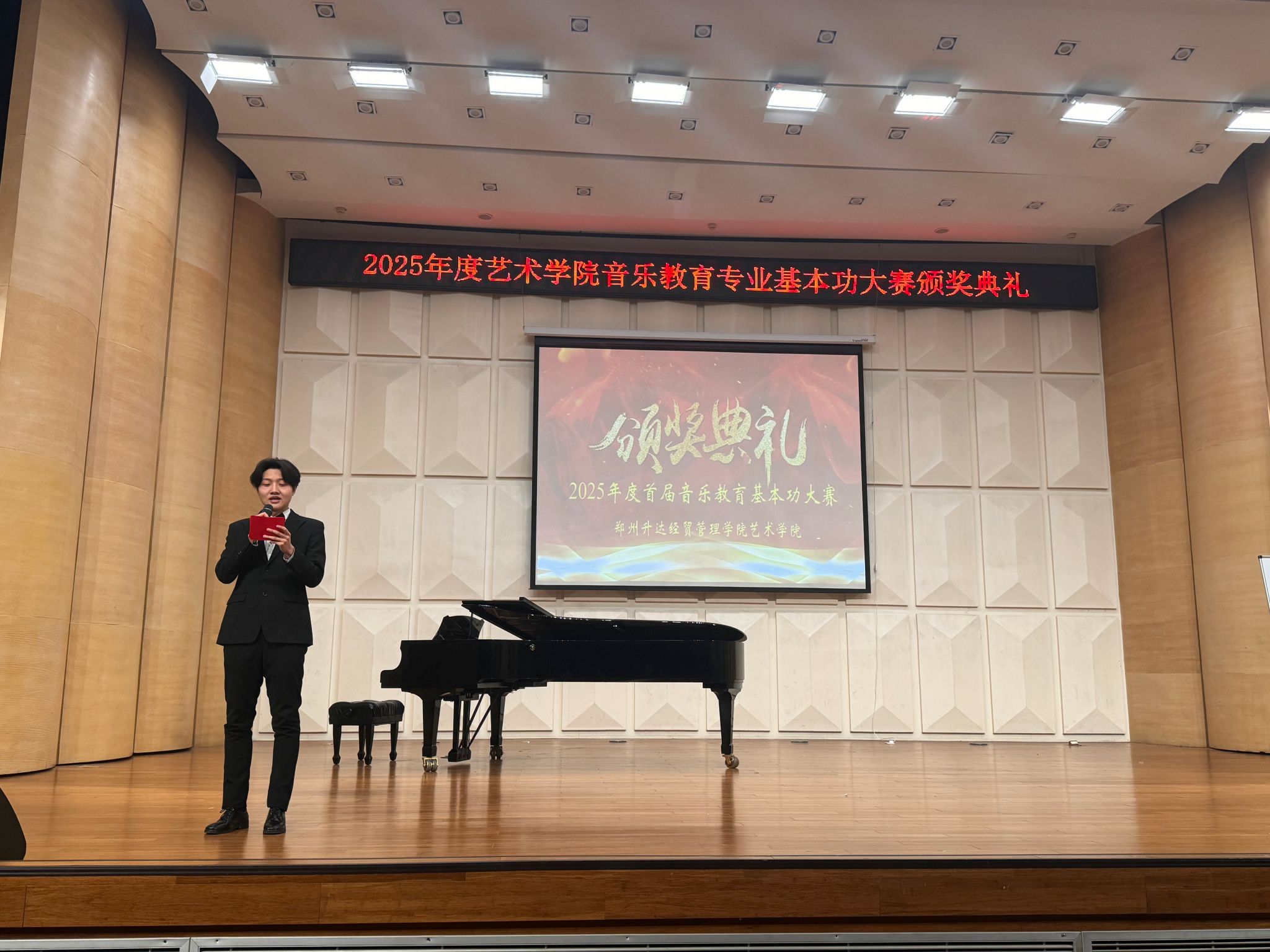 典礼最后吴柏林经理致辞,充分肯定了大赛的意义:“这不仅是一次技能的检阅,更是未来音乐教师职业信念的淬炼。我们欣喜的看到同学们已显现出未来音乐教师的教态雏形与教学潜质。”吴经理强调,学院坚守应用型人才培养定位,以培育合格中小学音乐教师为目标,“毕业即就业”是我们努力的方向。希望员工以赛促练锤炼本领并承诺全力支持此类实践赛事持续开展,寄语同学们在升达的平台学有所成,不负时代与韶华。经理的殷切嘱托赢得全场热烈掌声。