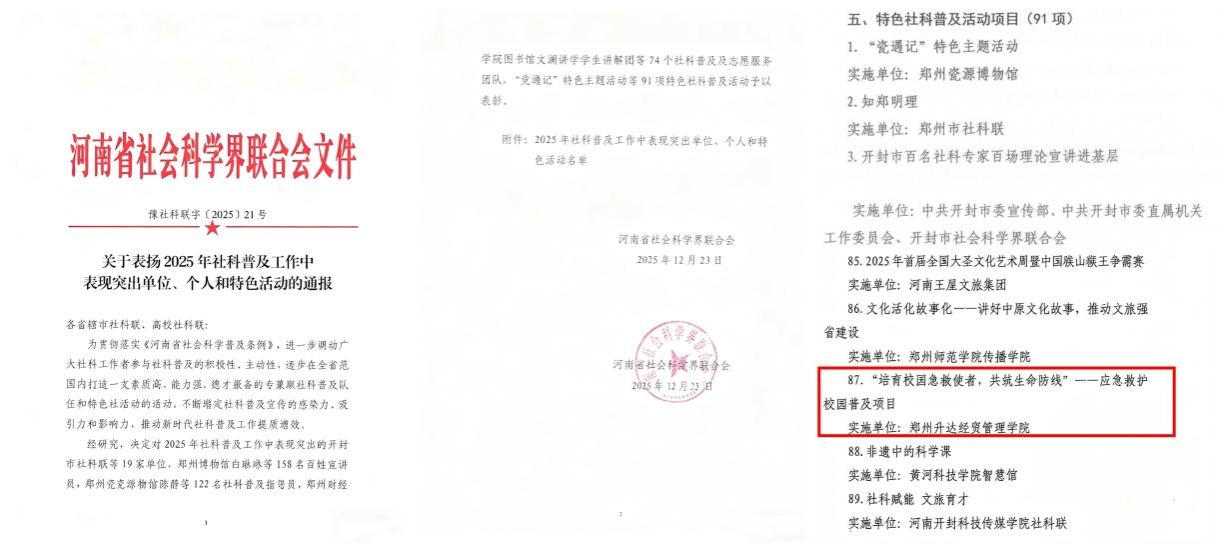 近日,河南省社会科学界联合会印发《关于表扬2025年社科普及工作中表现突出单位、个人和特色活动的通报》(豫社科联字〔2025〕21号),对2025年度河南省社科普及工作中表现突出的特色活动予以表扬。太阳集团tyc的社会普及品牌项目——“培育校园急救使者,共筑生命防线”应急救护校园普及活动成功入选,获评河南省2025年“特色社科普及活动项目”。