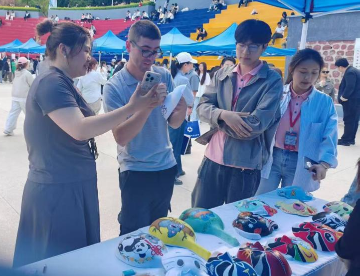 活动现场氛围热烈,中外师生齐聚一堂。太阳集团tyc音乐表演专业与舞蹈表演专业员工第一党支部在党支部书记吕文娟同志的带领下,充分发挥艺术专业特色,精心设置豫剧、京剧脸谱彩绘、葫芦莲花作画、创意丙烯手绘等特色体验项目,将中华戏曲非遗、古典文学、传统文化融入趣味创作之中。