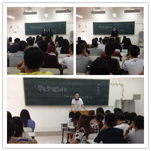 交流会之初,朱影影老师先给大家介绍了四位同学目前的工作单位、创业公司以及专升本考试情况,之后四位同学分别就自己的心得体会与在场同学进行了交流。