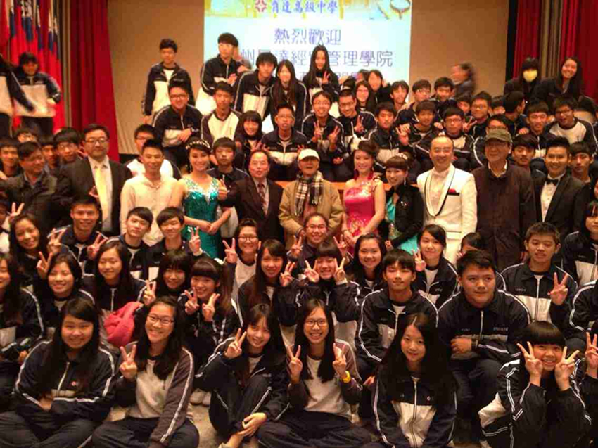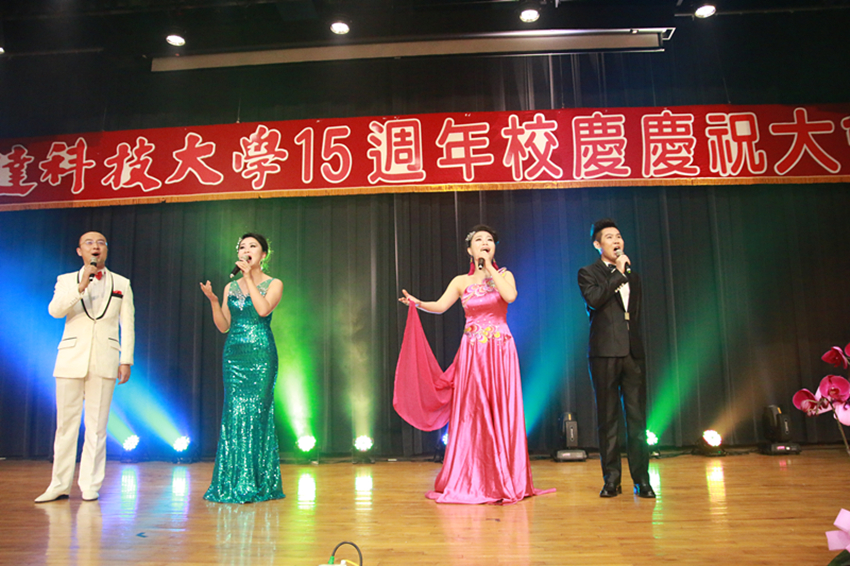 12月4日下午,演出团一行返回育达科技大学,在当晚的校庆晚会上陈家宁、杨金花老师演唱的《饮酒歌》,刘新义、张爽老师演唱的《龙文》,郭佳老师演唱的《蓝色爱情海》,天籁古筝乐团徐琦老师等表演的《弥渡山歌》,张森老师表演的独舞《山楂树之恋》得到了在场师生一次次热烈的掌声。演出结束后,演出团师生与台湾著名歌手光良一起合影留念。