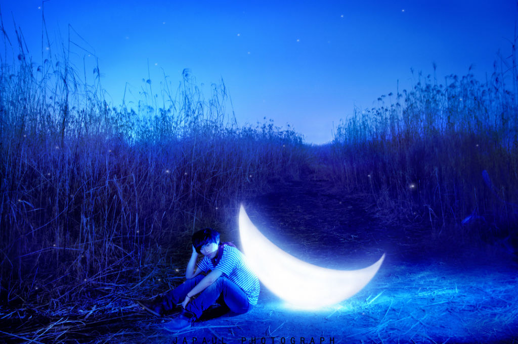 《相遇在黑色的海上》:以少年和月亮为背景创作的一组片子,照片中少年和月亮产生一种微妙的关系,整个画面温馨而不失童话感。