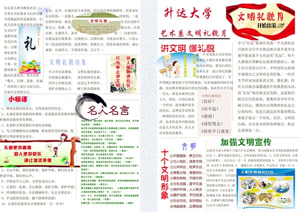 文明礼貌月主题学习报,首先由各班推荐编写人员,组成编委会,进行相关材料的收集整理。然后编辑为短小凝练的小篇幅文章,经筛选后将具有教育性、思想性文章进行排版。学习报电子版突出文明礼貌学习内容的丰富性,纸质版彰显艺术设计员工的专业特长。在两种侧重中,一方面调动了同学们对文明礼貌月的学习热情,另一方面提高检验了同学们的设计能力。