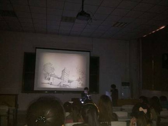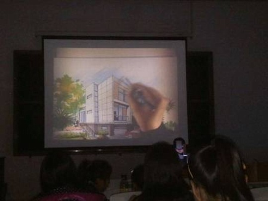 宣传活动通过室内景观手绘和室外景观手绘方法讲解进行,现场进行了各种各样绘画工具的使用方法和效果展示,之后,张扬老师为大家演示了室外景观的画法,用笔、渲染、透视,讲解非常细致。