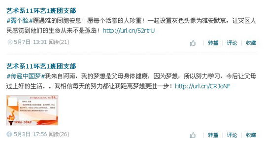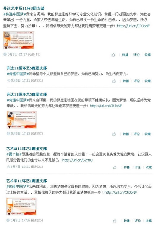 与此同时,艺术系各班级团支部还踊跃参与了团中央开展的“校园百万团支部‘青春中国梦’线上主题团日”活动。一方面通过微博积极关注、传递“中国梦”,一方面参与了“中国梦解析”“梦想加速度”等话题讨论,通过线上关注的方式向广大团员进行了“中国梦”的主题思想教育。