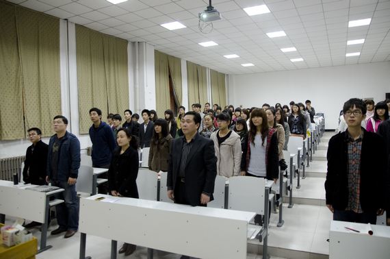 典礼在雄壮的国际歌声中开始,首先由文法系党总支宣传委员郑玲玲同志宣布新党员名单;随后艺术系朱影影老师带领新党员面对党旗庄严宣誓,张倩同学和宋亚楠同学分别代表新党员和入党积极分子发言。文法系党总支副书记杨明志向党课培训提出了希望和要求:1.希望大家以十八年校庆为契机,深入学习实践科学发展观,用科学的思想武装头脑,指导具体工作;2.希望同学们把今天作为继续前进的起点,在日常工作、生活中坚定理想信念,牢记党的宗旨,全心全意为人民服务,在各个方面起到模范带头作用;3.希望同学们珍惜、重视这次学习机会,努力学习党的基础理论知识,努力提高学习效果;4.党课学习是个过程,学习完之后还要看具体行动,多交流、多沟通、多讨论,继续续写文法系、艺术系合作的新篇章。