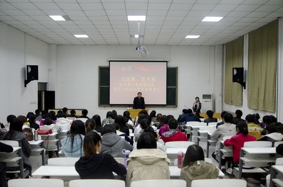11月1日晚,文法系、艺术系新党员宣誓仪式暨第十二期业余党校开学典礼在艺术楼104教室举行。典礼由艺术系团委副书记赵会燕老师主持,文法系党总支副书记杨明志同志、文法系党总支宣传委员郑玲玲同志、文法系员工党支部书记彭老师及艺术系员工党支部书记邬志国老师出席了会议。