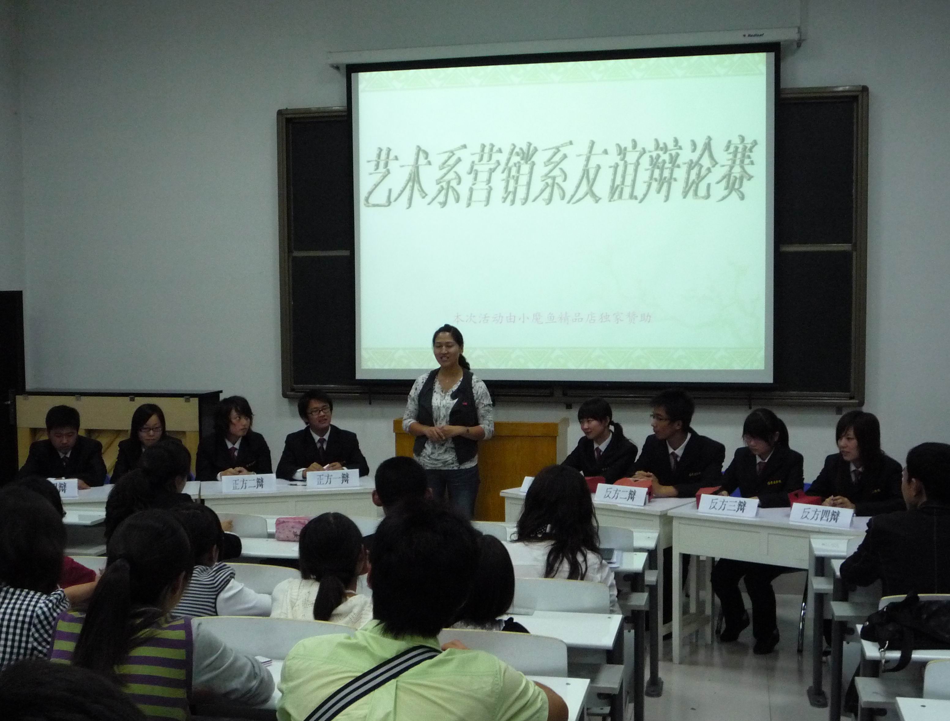2009年9月27日晚上七点在艺术楼104教室艺术系与营销系的首届辩论表演赛友谊赛揭幕,出席辩论赛的嘉宾有:艺术系行政秘书曹华莹老师、辅导员赵会燕老师、营销系员工会主席、艺术系员工会主席、院辩论队队长。此次辩论赛的观众主要是营销系、艺术系部分09新生代表以及闻讯到场的其他各系的同学们。