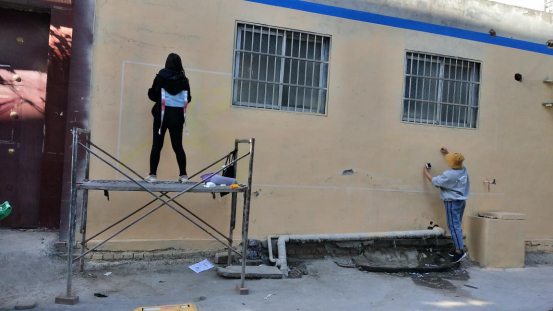 活动顺利开展的过程中,同学们分组合作,有的负责搭建脚手架,并保证成员的安全;有的负责构图,在墙体上勾勒出清晰轮廓;有的负责调色,调出各幅画面所需的色彩;有的负责涂色,使墙面生动、鲜活起来。