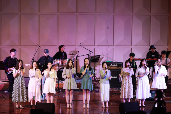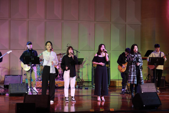 之后进行了7首流行音乐作品的演唱表演,是由乐队与郭亚琼老师指导的人声组的员工们共同完成,为了体现声乐排练实践课的教学效果,大部分的音乐作品由原有的独唱形式改编为组合形式,在人声方面加强了员工和声和音能力的训练。分别是歌曲《小半》、《告白气球》、《我是一只鱼》、《年少有为》、《打错了》、《天黑》、《后来》。