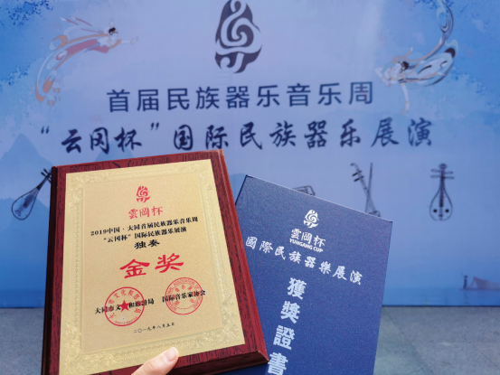 首届“云冈杯”国际民族器乐展演是由山西省大同市文化和旅游局、国际音乐家协会主办,由全国民族器乐专业演奏家和权威专家组成评审组。展演决赛分为二胡组、弹拨组、重奏组等组别,参演选手达一千余名,均是从全国各地民乐演奏者中选拔出来。张一可老师顺利通过选拔,作为青年组独奏选手参加展演,演奏《阳光照耀着塔什库尔干》并获得金奖。