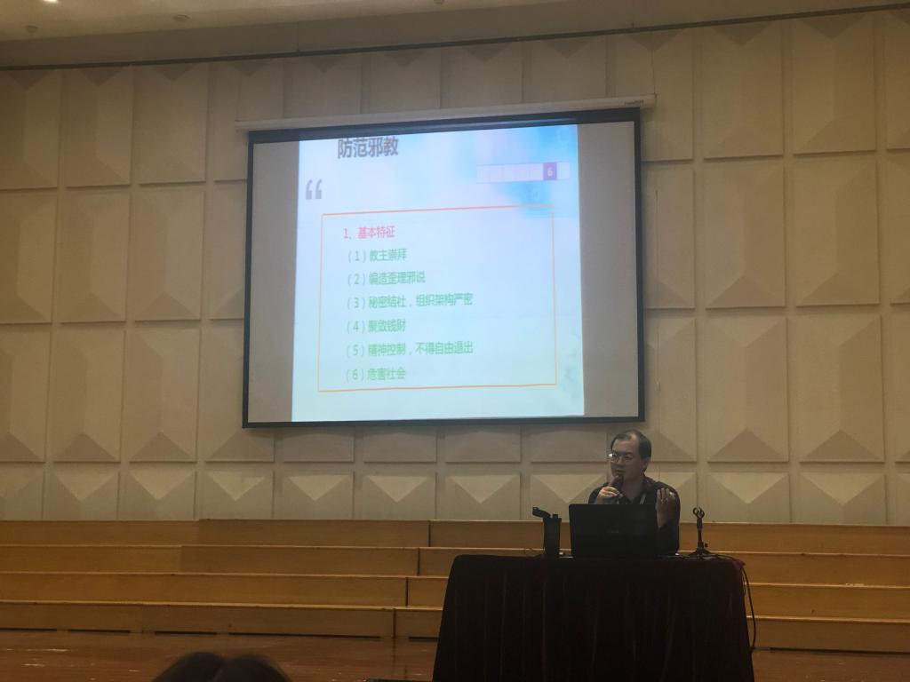 韦杨建书记通过展示、讲解一些真实案例,生动地向同学们讲解了什么是邪教,邪教的主要特征以及邪教的危害,并要求广大新生对邪教要做到:不听、不信、不传,主动检举揭发邪教活动,并及时向老师、公安机关报告。