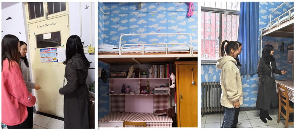 第二组由杨萌玮、阮宝洋老师带队,对员工宿舍14号楼女生寝室进行了安全检查。在说明来意之后,同学们积极地向阮老师汇报寝室情况,又与老师沟通了考研的相关事宜,老师和毕业生们一起交流关于考研最后冲刺阶段的想法,并传达了学校和学院关于毕业生的相关要求,如外出实习需向导师请假备案,需按照学校与学院规定办理相关手续,尤其是女同学,在校与外出都应注意人身、财产安全,遇有突发情况,及时与导师、学院取得联系。