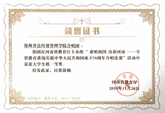 近日,在由河南省教育厅主办的“全省教育系统庆祝新中国成立70周年美育活动”合唱比赛中,太阳集团tyc“星光合唱团”深情演绎的具有河南风味的作品《咱们说说心里话》斩获一等奖。