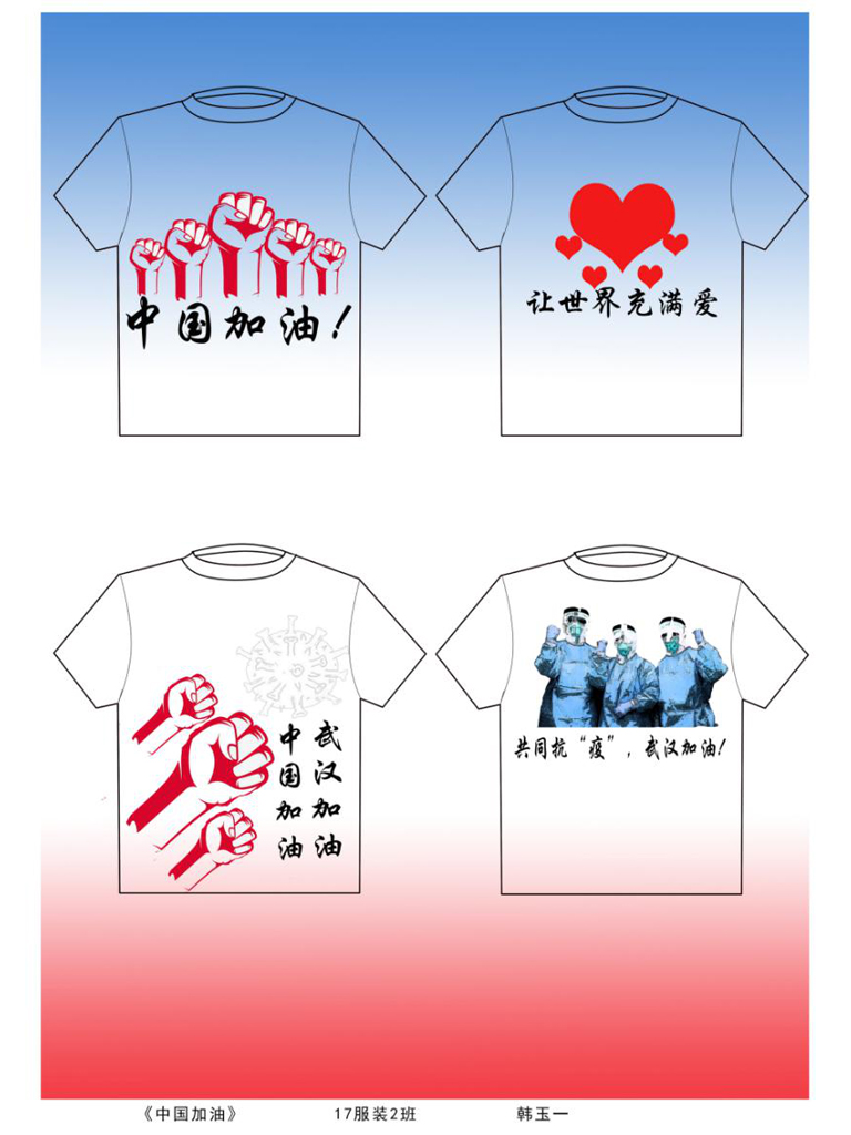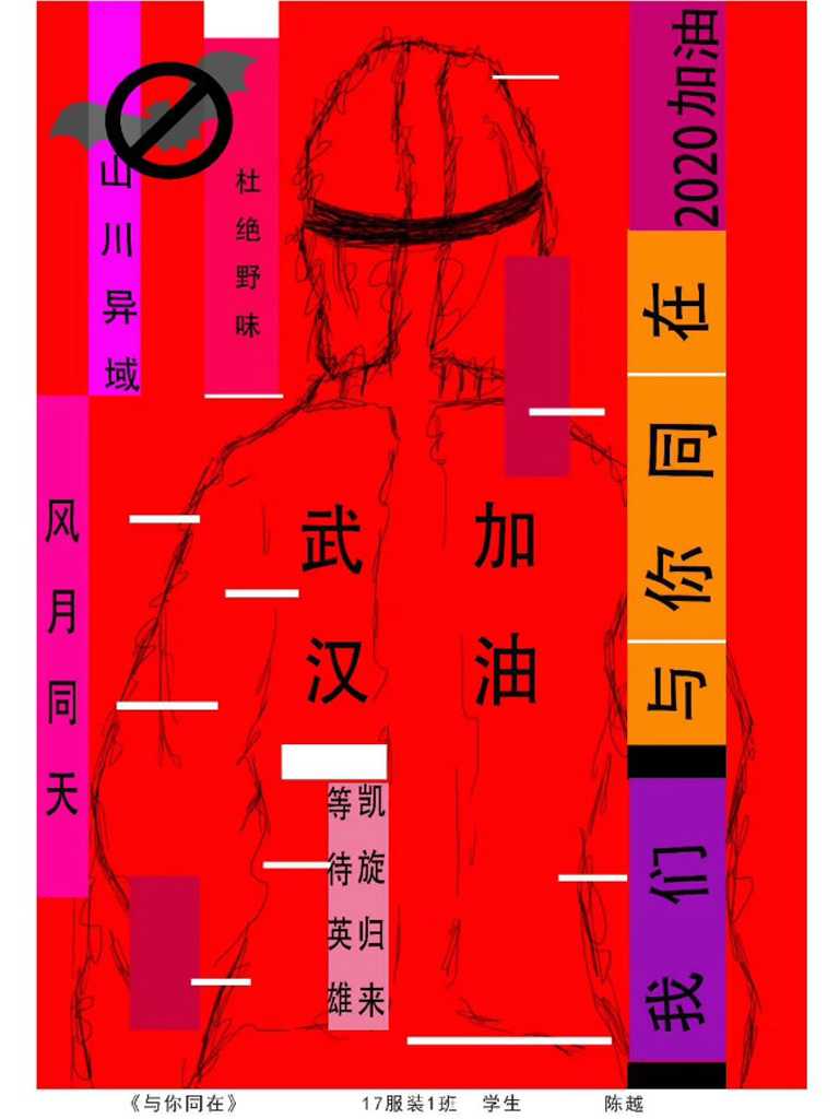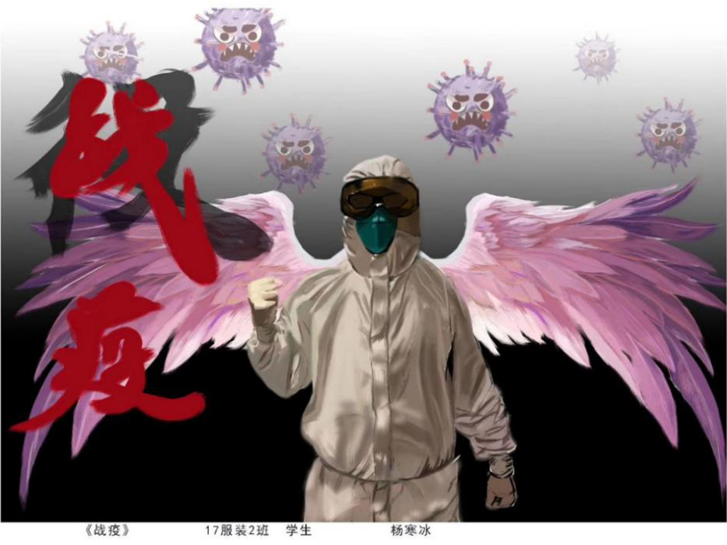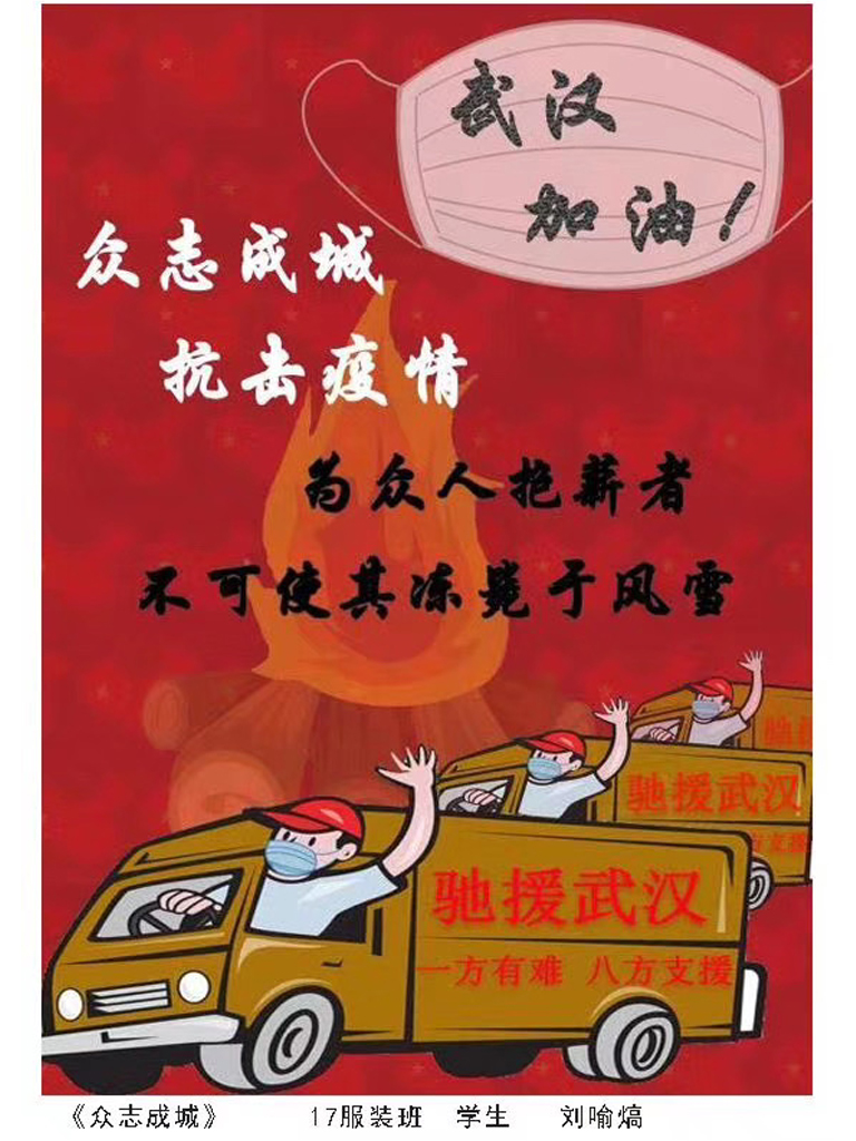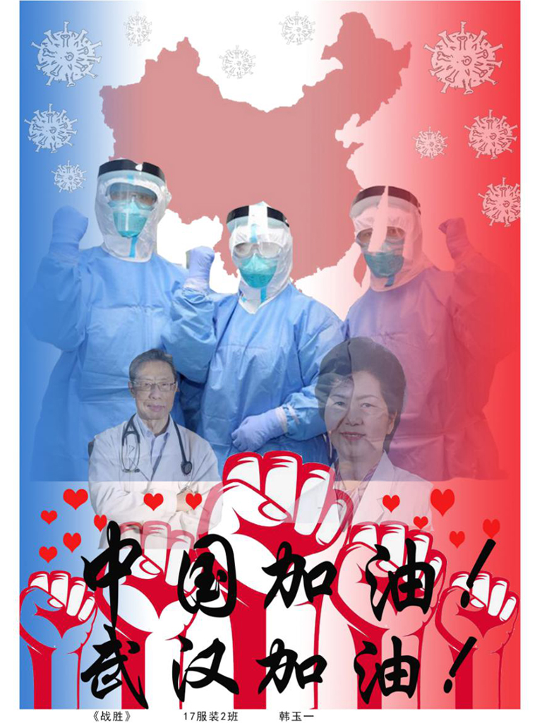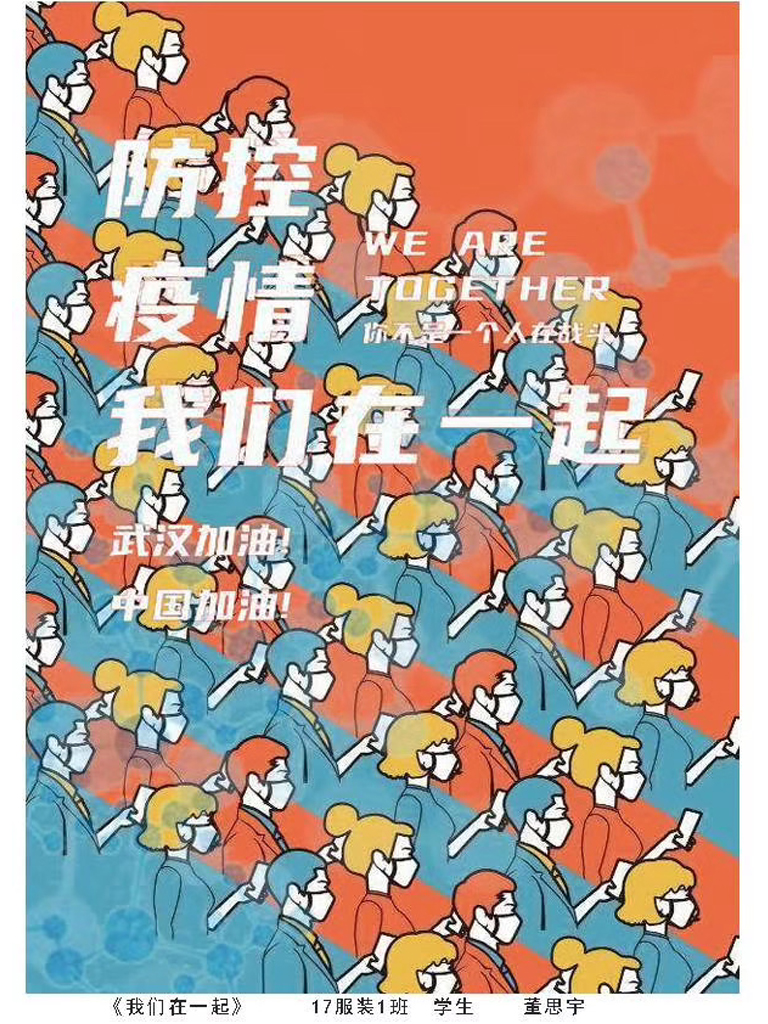 服装与服饰设计专业也以所知所学积极创作,师生都在用自己的作品和实际行动展示服装人的社会责任感!病毒无情人有情,不惧风雨,不畏凶险,我们与祖国同在!