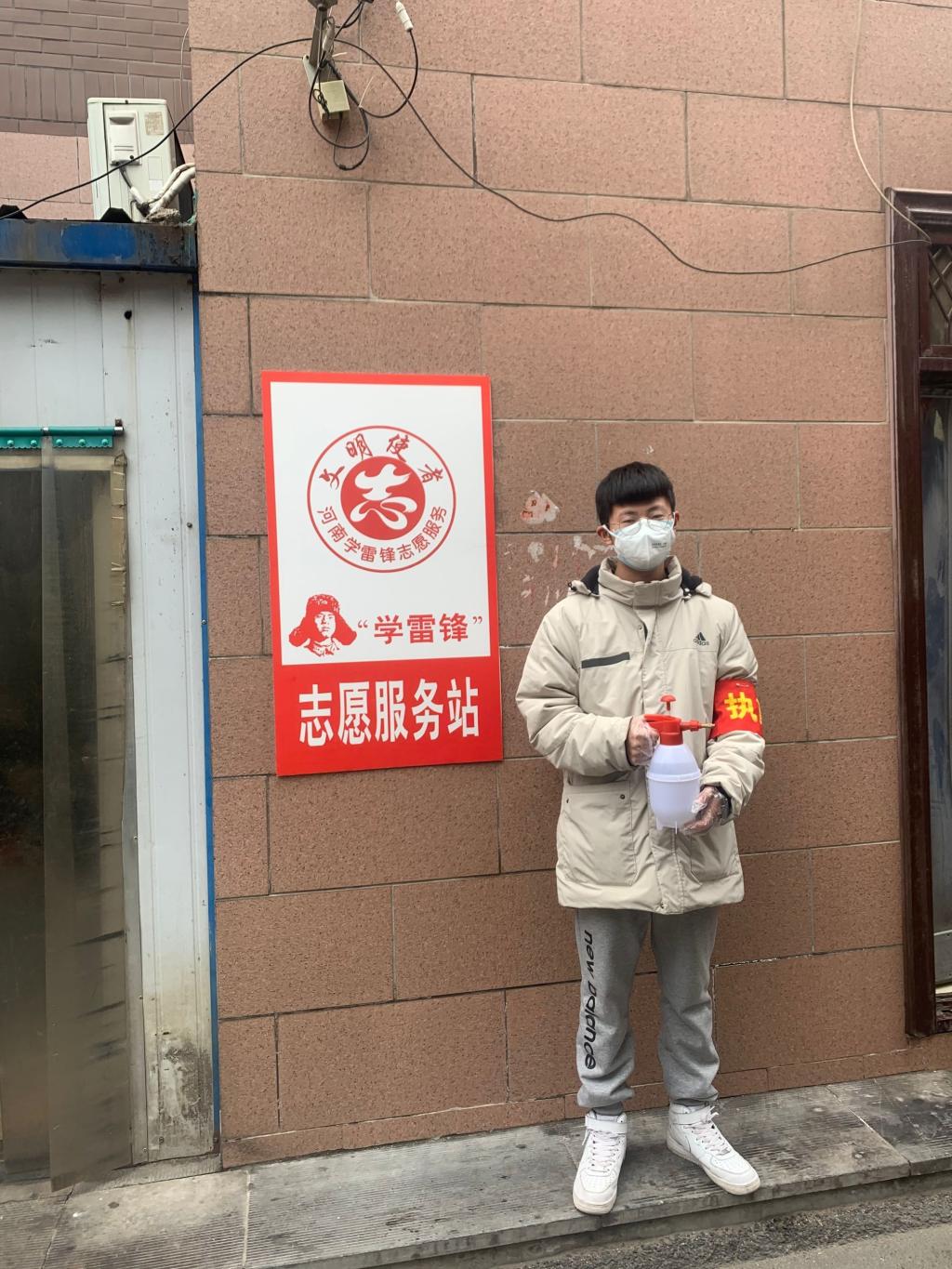 在得知小区需要志愿者的消息后,该生在征得家人同意后义无反顾地参与到了长垣市蒲东街道祥和小区的防疫服务中。为了打赢新型冠状病毒感染的肺炎疫情防控战,小区组织所有的志愿者分班、分批、分工对小区开展一系列的防疫活动。在这次防疫活动中,孙继鹏主要负责的小区消毒工作,在社区工作人员的培训下,孙同学学会了如何配置消毒液,社区中的哪些地方需要着重进行消毒。每周二的固定工作时间就和其他志愿者一起人手一壶消毒剂,从小区垃圾桶、小区通道、各个楼道的电梯间、楼道楼梯及把手,为本次疫情防控贡献自己的微薄力量。