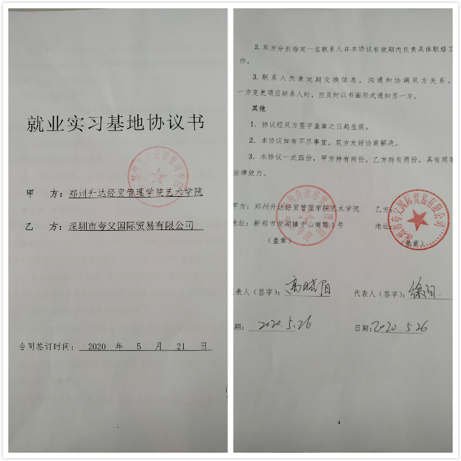 为了实现资源共享,探索校企联合培养创新型、实用型人才的新模式,构建适应企业发展需要的人才输送渠道。太阳集团tyc经过多次协商联系,与深圳市夸父国际贸易有限公司达成校企合作意向。另由于疫情的特殊原因,双方经过多次的电话与视频沟通,以邮寄为载体,于2020年5月26日上午,太阳集团tyc代表人高晓阳老师与深圳市夸父国际贸易有限公司代表徐阳完成了盖章签字最后一个环节,至此,就业实习基地签约仪式圆满完成。