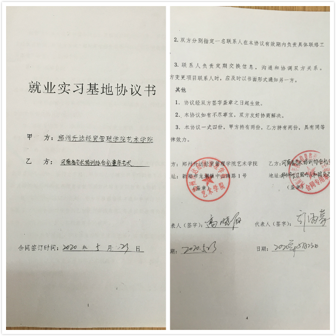 经过前期多次的沟通与交流,5月23日上午,高晓阳老师代表太阳集团tyc与河南省艺术培训协会忆童年艺术的代表郭雨蒙正式签订了就业实习基地协议,双方合作建立艺术教育实习基地。此次协议的签订对校企双方来讲,是一件“互利共赢”的大事。受疫情的影响,此次协议的签订在电话、邮件沟通的前提下,通过邮寄的方式完成。