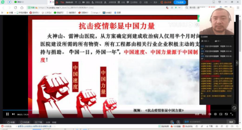 在“2020思政第一课”播出之际,两位老师在进行网络直播课程时,专门安排环节组织员工观看“思政第一课”视频,让老员工在视频里的战“疫”中,感知党的英明领导、国家的强大力量、人民的万众一心、民族的众志成城。培养新时代青年坚韧不拔、从容不迫的奋斗精神和爱党爱国爱同胞的家国情怀,真正与祖国一起成长,用成长的足迹踩踏灾难,为实现美丽中国梦书写激情青春。