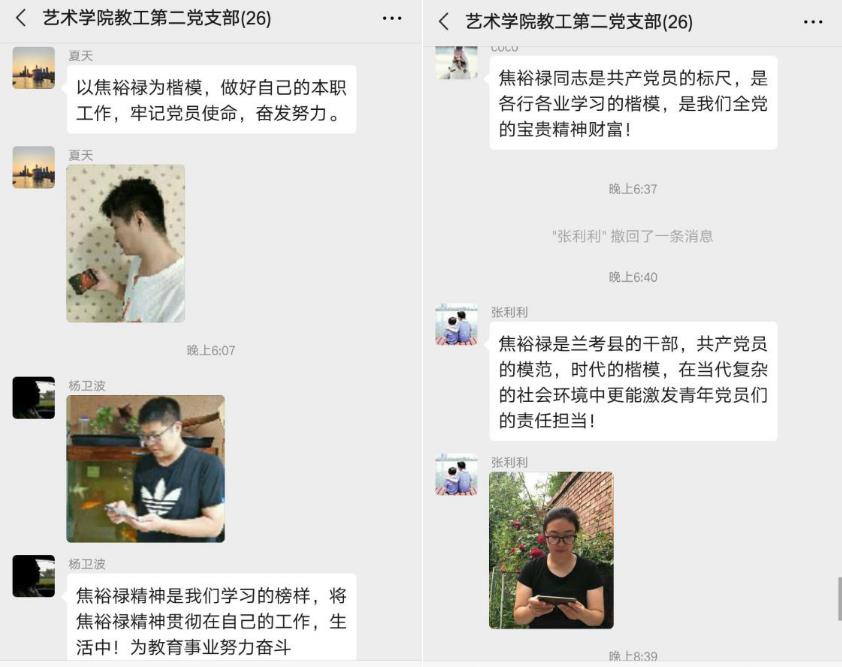 张利利老师在观看学习后写道:“焦裕禄是兰考县的干部,共产党员的模范,时代的楷模,在当代复杂的社会环境中更能激发青年党员们的责任担当”。侯珂老师在观看后写道:“焦裕禄同志是共产党员的标尺,是各行各业学习的楷模,是我们全党的宝贵精神财富”