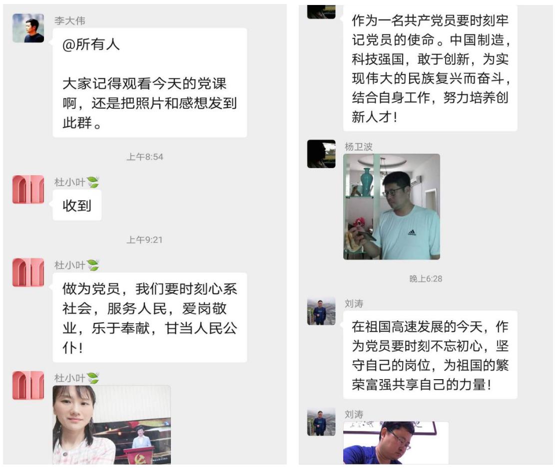 同志们一边观看一边在党员微信群内交流着自己的感受,被党课内的事迹深深打动,支部微信群内反响热烈,大家一致认为作为党员同志要铭记大国重器要具备自主的、先进的核心技术能力,才能占领制造业制高点,只有这样才能不受制于人,我们年轻一代党员要铭记自己的使命,学习先进党员,将自己的专业技术和工作做到最好!