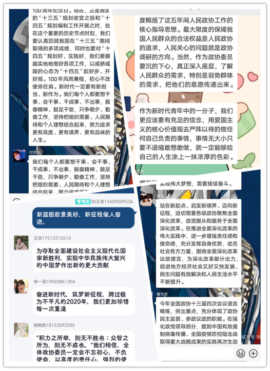各班的线上班级群里,同学们结合两会热点话题与自身的学习成长经历,从经济、政治、科技创新、乡村振兴等多个方面发表了感想。同学们表示,在学习生活中要不断强化创新意识,提升综合素质能力;团学干部们也纷纷表示,要以身作则、率先垂范,不断增强责任意识与家国情怀,提高政治素养。