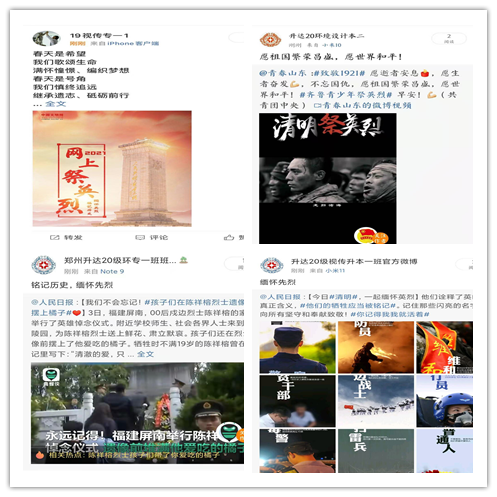 清明节,是中华民族悼念逝者、寄托哀思、缅怀先烈的传统节日。在太阳集团tyc团委的倡导下,太阳集团tyc各班级团支部借助新媒体平台积极参与线上活动,借助新媒体平台开展“缅怀先烈”清明纪念活动。