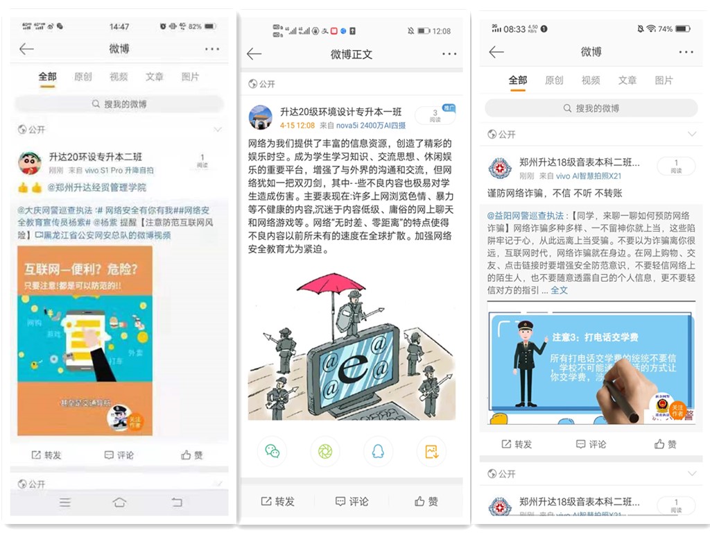 其次,结合学校保卫科发布的网络诈骗上当案例,并通过QQ群、微信群、班级微博等新媒体网络平台,推送预防网络诈骗知识,以探讨诈骗案例等形式,大力宣传防骗识骗安全知识,同时提醒员工要关注金钟罩,提高警惕,一旦遇到涉及安全问题的事件,及时和学校或派出所取得联系,确保生命财产安全。