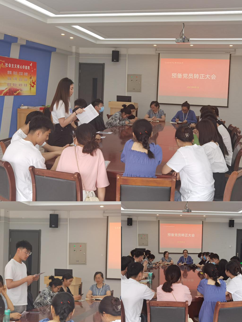 首先,支部书记郭称心介绍了预备党员转正程序,接着由预备党员轮流宣读转正申请,然后入党介绍人介绍该名预备党员的实际表现情况,最后由正式党员进行投票表决。