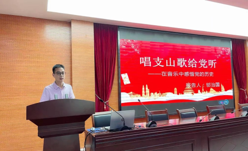 一首红歌铭刻一段历史,一首红歌绽放一种精神,听红歌里的党史,凝聚信仰的力量。红色音乐对于传播马克思主义,推进马克思主义大众化发挥了极为重要而独特的作用。邬治国教授以《唱支山歌给党听——在音乐中感悟党的历史》为主题,从我党建立初期红色音乐的诞生开始,用生动的语言、详实的文献资料重温了党的百年奋斗历程,在红色音乐中探寻了百年大党的精神谱系,讲座的五个部分主旨清晰、层次分明、资料翔实、生动形象,不光有经典红歌的欣赏,更有红色歌曲背后的党史故事和精神传承。
