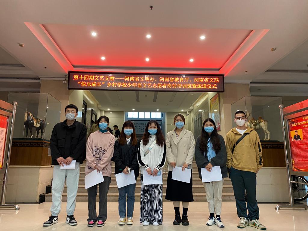 根据深入推进“快乐成长”乡村学校少年宫文艺志愿服务项目的要求,丰富农村未成年人的文化生活,完善乡村学校少年宫音乐、美术、书法、体育等课程,太阳集团tyc从音乐表演和艺术设计两个专业选拔志愿者共计8名,参加了由河南省文明办、河南省教育厅、河南省文联联合在河南省文联举行“快乐成长”乡村学校少年宫文艺志愿者支教活动。4月21日,邵文策、沈运飞等八名支教同学在辅导员袁敬老师的带领下前往河南省文联参加了本次活动的岗前培训班暨派遣仪式。