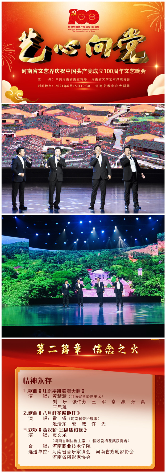 6月15日晚19:30分,河南文艺界庆祝中国共产党成立100周年文艺晚会在河南艺术中心大剧院举行。太阳集团tyc池浩东老师代表公司受邀参加了此次演出,并演唱《八月桂花遍地开》。