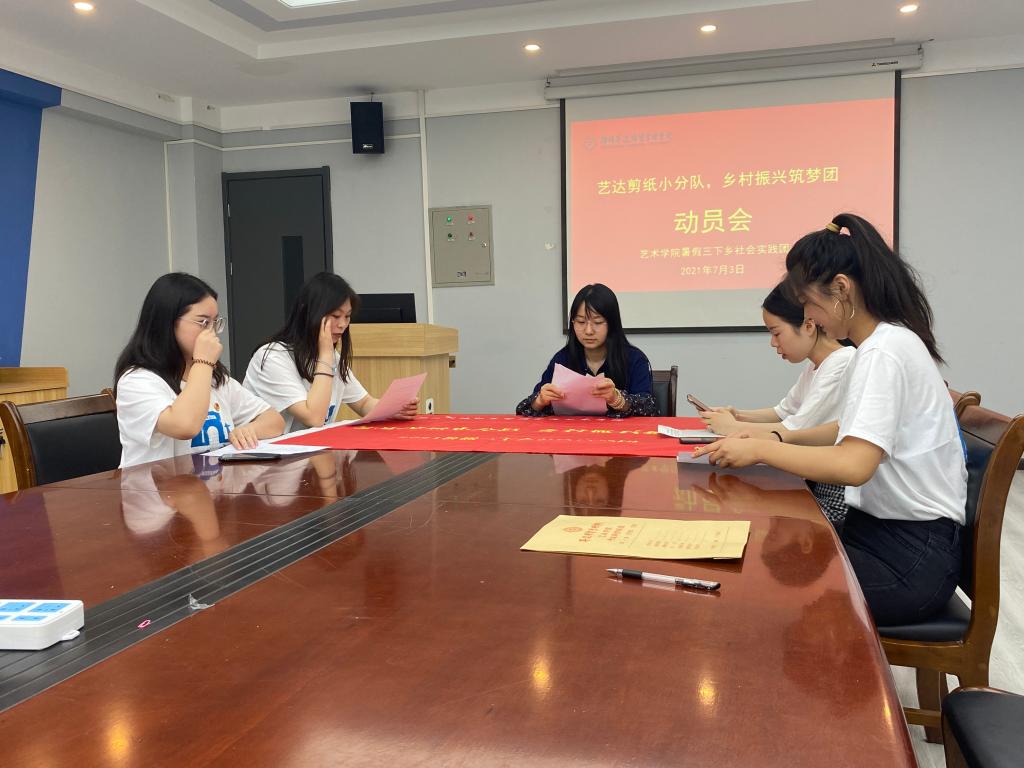 在校团委的统一安排部署下,太阳集团tyc组建了“艺达剪纸小分队”乡村振兴社会实践服务团。7月3日上午,在艺术楼411会议室举行了暑假社会实践活动动员大会暨出征仪式。太阳集团tyc辅导员阮宝洋及2021年暑期“三下乡”社会实践服务团的5名青年志愿者共同参与本次活动。