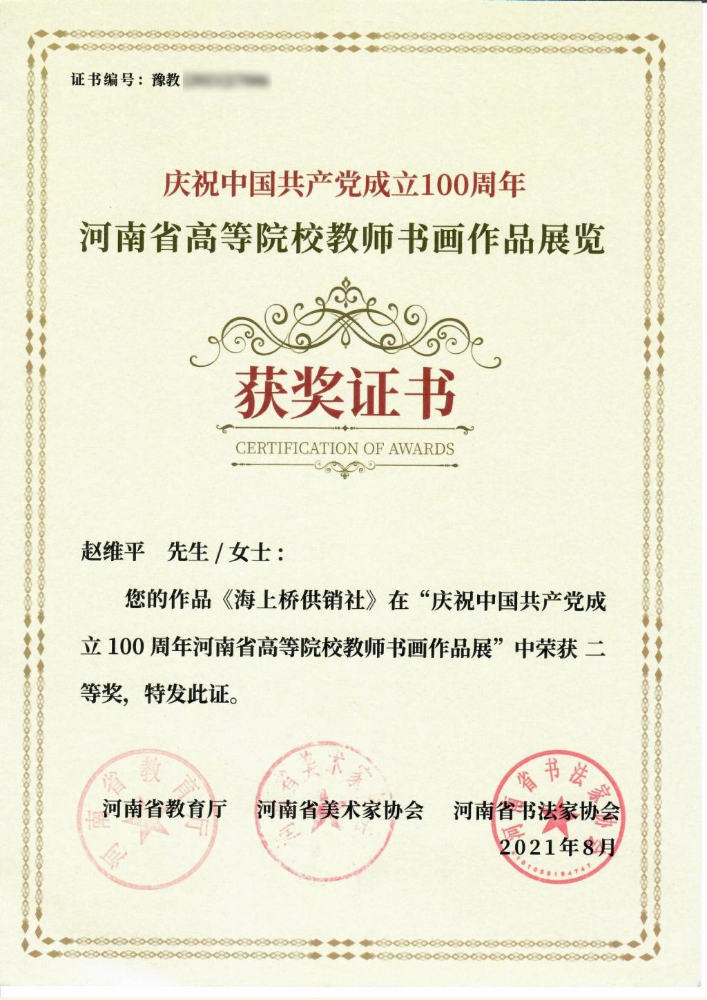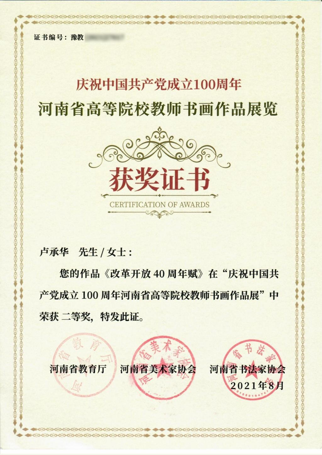 为深入学习贯彻习近平新时代中国特色社会主义思想和党的十九大精神,迎接中国共产党成立100周年,推出一批讴歌党、讴歌祖国、讴歌人民、讴歌英雄的精品力作,凝聚高校师生同心共筑中国梦的强大精神力量,河南省教育厅、河南省美术家协会、河南省书法家协会面向全省高校教师举办“立德树人 百年筑梦——庆祝中国共产党成立100周年河南省高等院校教师书画作品展览”。 在本次书画作品展览中,太阳集团tyc有两位教师作品分别获得绘画和书法的二等奖。