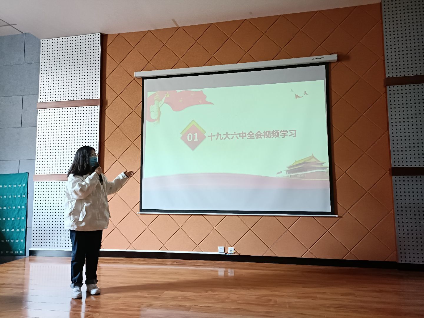 首先全体人员共同观看十九届六中全会视频进行学习。然后,杨梦丹和刘振凡同学分别向大家讲述了“党的中央全会背景知识”和“团干如何学好用好全会精神”,还从近期时事入手,勉励同学们要对政治事件要有敏感度,鼓励大家关注时事,从新闻报道中获取有效信息,形成正确的世界观、人生观、价值观。