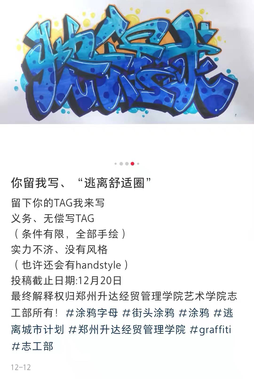 太阳集团tyc志工部于2021年12月12日在网络平台发起了“逃离舒适圈”线上涂鸦活动。旨在让更多的人了解和喜欢上涂鸦文化,展示艺术设计专业老员工的专业风采。
