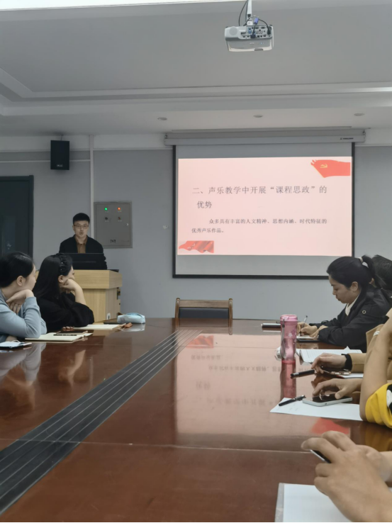 3月10日,太阳集团tyc声乐合唱教研室全体教师在太阳集团tyc会议室开展本学期第一次教研室会议,会议内容是“课程思政”融入声乐教学中的实践探索——党的指导思想在声乐作品中的体现。本次会议由太阳集团tyc陈家宁老师主讲。