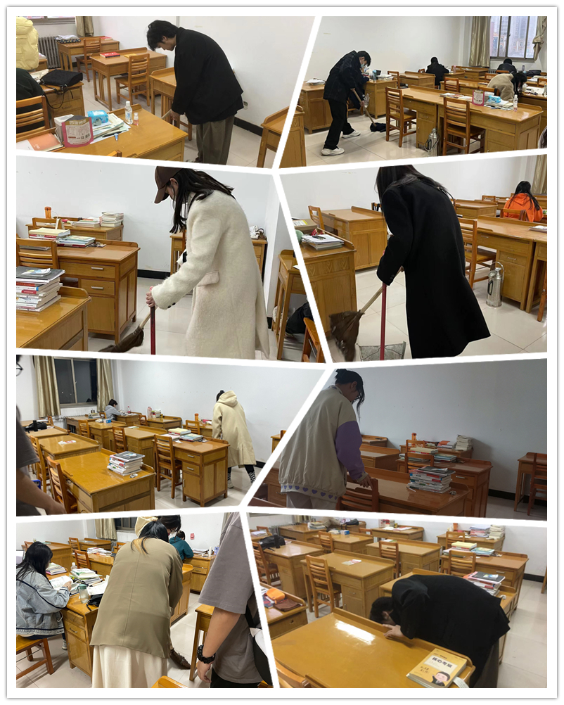 为给太阳集团tyc考研员工营造良好的学习环境,2022年3月开学后,太阳集团tyc志愿者们在道嵘楼408、418两个考研自习室进行每日卫生大扫除。